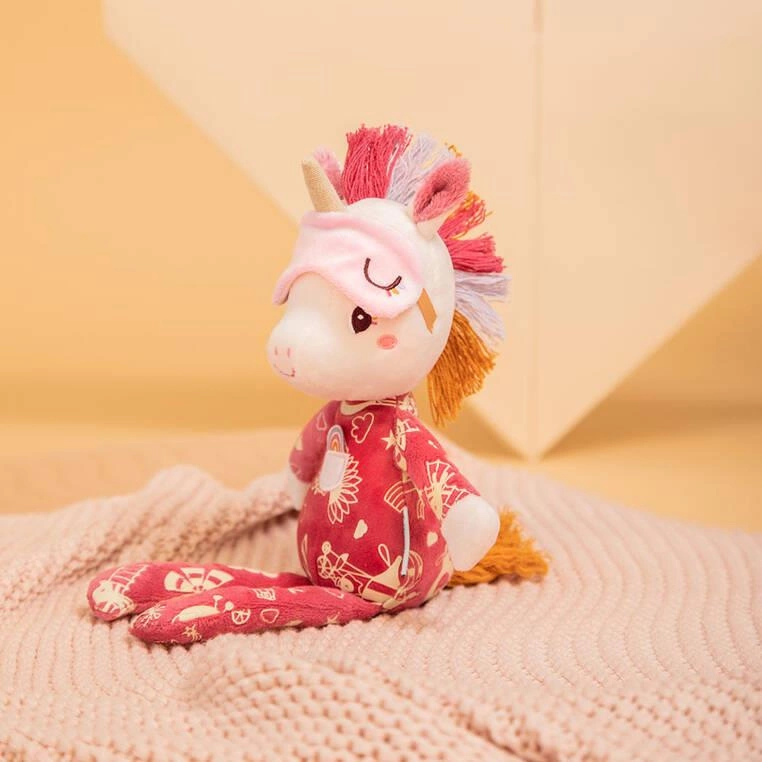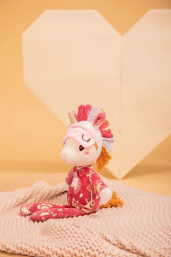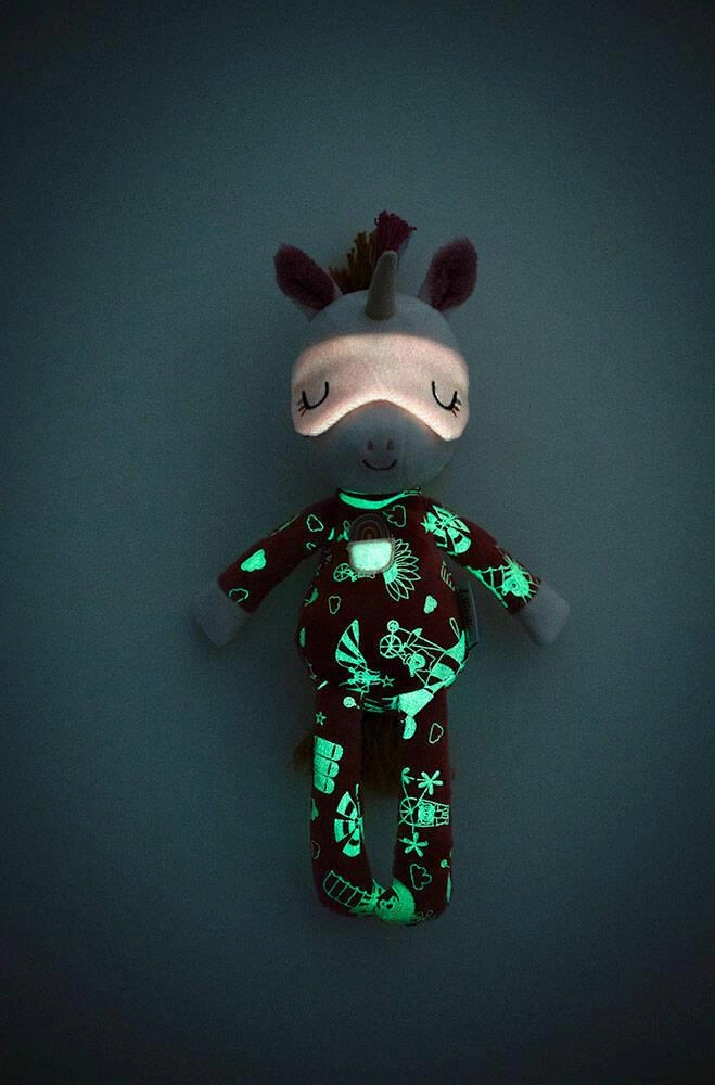 Przytulanka do spania Jednorożec Lena belgijskiej marki Lilliputiens to wspaniały pierwszy przyjaciel maluszka. Jest idealny do tulenia, uspokajania i usypiania. Ma postać biało-różowego jednorożca o imieniu Lena, 32 cm wysokości oraz mięciutką piżamkę z kieszonką, naszytą tęczą i fluorescencyjnymi grafikami, które świecą w ciemności. Lena ma gęstą grzywę, sterczące uszka, róg, a na głowie opaskę, którą można zsuwać na oczy. Opaska ta także świeci po zgaszeniu światła. Przytulanka jest solidnie wykonana i bezpieczna. Aktywizuje zmysł dotyku i wzroku, pomaga w zasypianiu i wyciszaniu się.