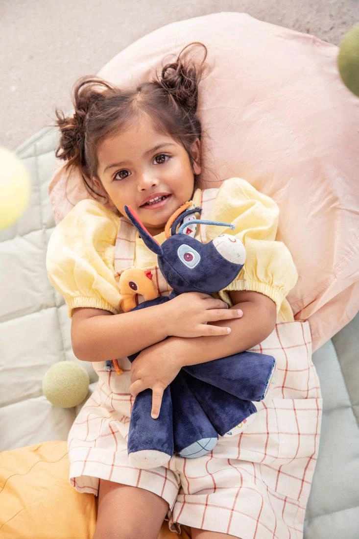 Przytulanka dźwiękowa z kolekcji Osiołek Ignace belgijskiej marki Lilliputiens to niebanalne, miękkie źródło rozrywki dla maluszków. Ma postać długouchego Osiołka Ignace'a z bujną grzywą ze sznureczków i sterczącym ogonkiem. Osiołek ryczy, a każda z jego nóg jest źródłem różnych dźwięków: jedna piszczy przy naciśnięciu, druga szeleści przy pocieraniu, kolejna potrząsana dzwoni, a kopyto ostatniej stanowi transparentna grzechotka z kuleczkami. Na grzbiecie Ignace'a umieszczony jest żółty ptaszek-uchwyt. Różnorodność odgłosów i wszystkie odstające elementy dodatkowo stymulują sensorycznie i zachęcają do trenowania chwytu. Zabawka zaskakuje i pobudza dziecięcą wyobraźnię. Rozwija małą motorykę (chwytanie, potrząsanie, pocieranie, ściskanie), aktywizuje zmysł słuchu (dzwonek, grzechotka, szelest, ryk, piszczałka) oraz pomaga zauważać zależności przyczynowo-skutkowe.