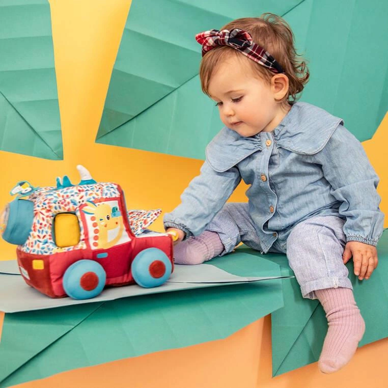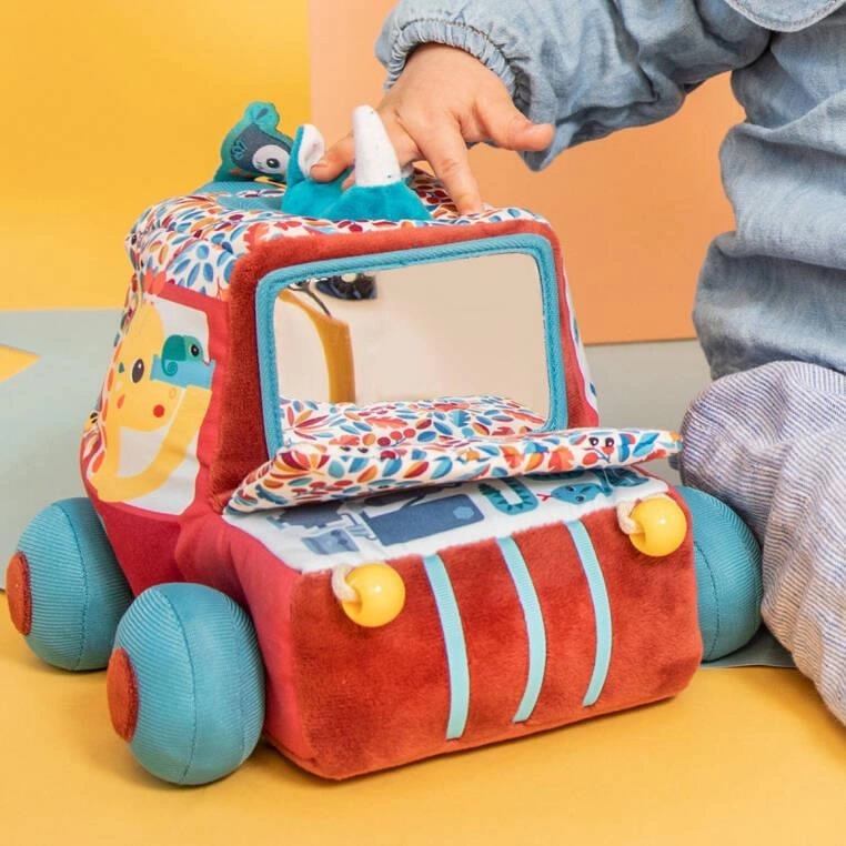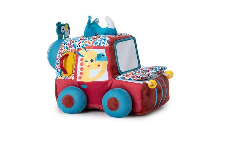 Całość jest solidnie wykonana i w pełni bezpieczna. Zaskakuje i pobudza dziecięcą wyobraźnię. Rozwija małą motorykę (chwytanie, potrząsanie, przesuwanie, pociąganie, wkładanie, wyciąganie), aktywizuje zmysł słuchu (grzechocze, piszczy), wzroku (lusterko) i dotyku (różne wypustki i tkaniny).