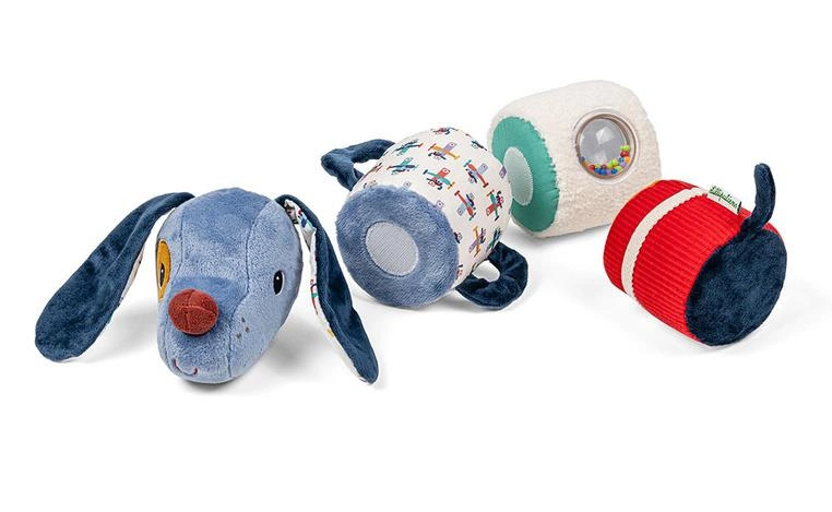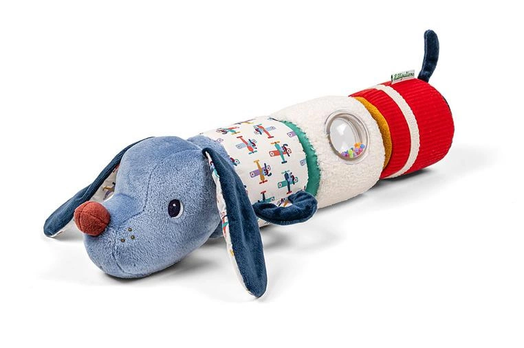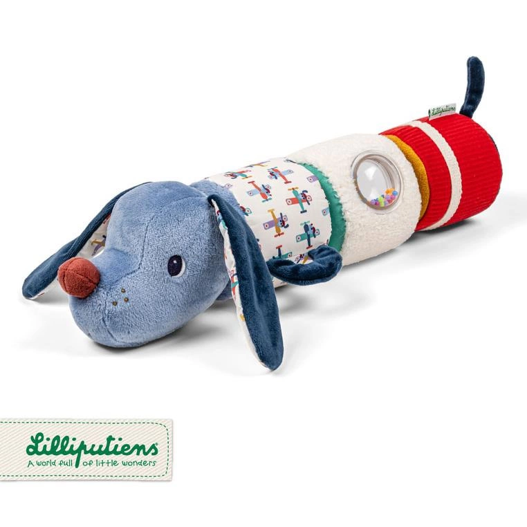 Wałek dźwiękowy z kolekcji Piesek Jules belgijskiej marki Lilliputiens to niebanalne, miękkie i wielofunkcyjne źródło rozrywki i nauki. Wałek składa się z 4 poręcznych elementów, z których każdy uszyty jest z materiałów o różnych wzorach i fakturach oraz posiada ukryte funkcje. W głowie pieska znajduje się grzechotka, inna część szeleści, kolejna posiada okienko z kolorowymi, grzechoczącymi kuleczkami i miękkim lusterkiem, a ostatnia ma ukryty wewnątrz dzwoneczek.