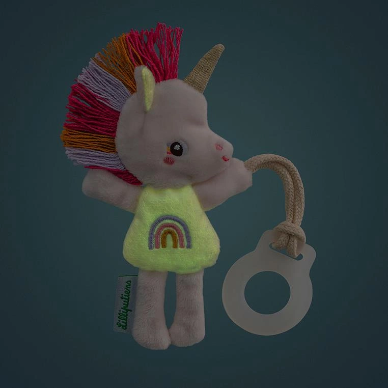 Mini-przytulanka do spania Jednorożec Lena belgijskiej marki Lilliputiens to wspaniały pierwszy przyjaciel maluszka. Jest idealna do tulenia, uspokajania i usypiania. Ma postać białego jednorożca z bujną kolorową grzywą i rogiem, sznurkową zawieszką do której można przymocować smoczek (na dwa sposoby) oraz z fluorescencyjnymi uszami i brzuszkiem (świecą w ciemności). Przytulanka jest dość płaska, więc może pełnić także funkcję komfortera. Jest solidnie wykonana i bezpieczna. Aktywizuje zmysł dotyku i wzroku, pomaga w zasypianiu i wyciszaniu się.