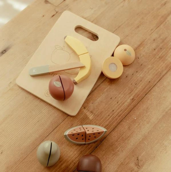 Zestaw składający się z owoców, takich jak: jabłuszko, banan, kiwi, gruszka, pomarańczka, arbuz oraz deseczka wraz z bezpiecznym, drewnianym nożykiem. Wszystko można przeciąć na pół i łatwo skleić ponownie za pomocą rzepów. Owoce idealnie sprawdzą się do nauki oraz wpajania maluchom zasad zdrowego odżywiania już od najmłodszych lat. Doskonałe uzupełnienie do naszej kuchennej serii, w skład której wchodzą kuchnia, ekspres do kawy i toster. Dostępny również zestaw z warzywami. Świetna zabawa gwarantowana!