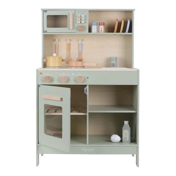 Duża kuchnia pastelowa Little Dutch wykonana jest z drewna bukowego z certyfikatem FSC. Pięknie wykończona z dbałością o najdrobniejszy szczegół, utrzymana jest w pastelowej kolorystyce z przewagą pięknego, miętowego koloru, dzięki czemu będzie ona idealna zarówno dla dziewczynek, jak i dla chłopców.  W tej kuchni najdziecie zamykany piekarnik, mikrofalówkę, płytę grzewczą, zlew oraz całe mnóstwo półek do przechowywania zabawkowych naczyń. W skład zestawu wchodzą również:  talerzyki, garnek z przykrywką, patelnia, solniczka i pieprzniczka oraz zestaw łyżek i szpatułek drewnianych.