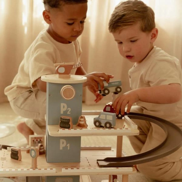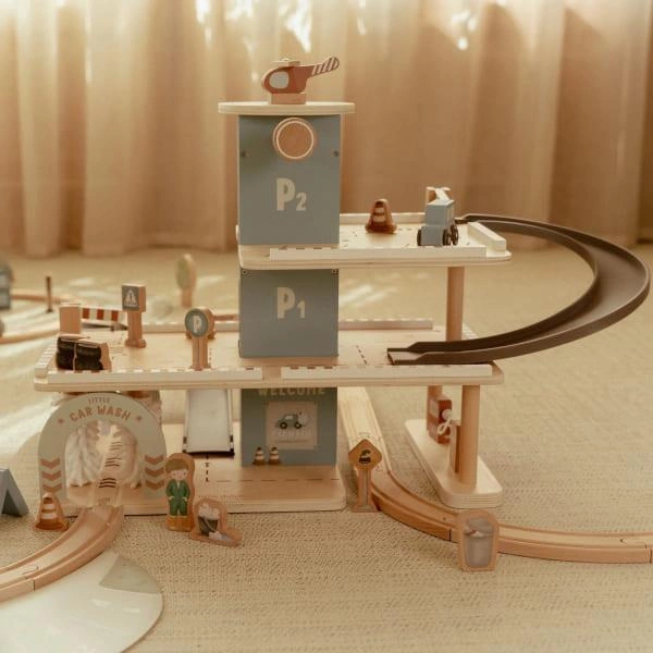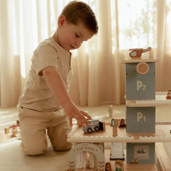 Garaż wielopoziomowy Little Dutch jest fantastycznym sposobem na długie godziny ciekawych zabaw. Łatwy w użyciu podnośnik samochodowy podnosi samochody w górę i w dół, co sprawi mnóstwo frajdy. Helikopter ma własną platformę śmigłowcową, a wszystkie samochody można parkować na każdym z poziomów parkingu. W zestawie znajdują się auta, helikopter, znaki i figurki. Garaż posiada również myjnie samochodową oraz stacja benzynową. Fantastyczna zabawa gwarantowana!  Starannie wykonany z drewna z certyfikatem FSC (Forest Stewardship Council), pokryty bezpiecznymi farbami na bazie wody. Doskonały pomysł na prezent.