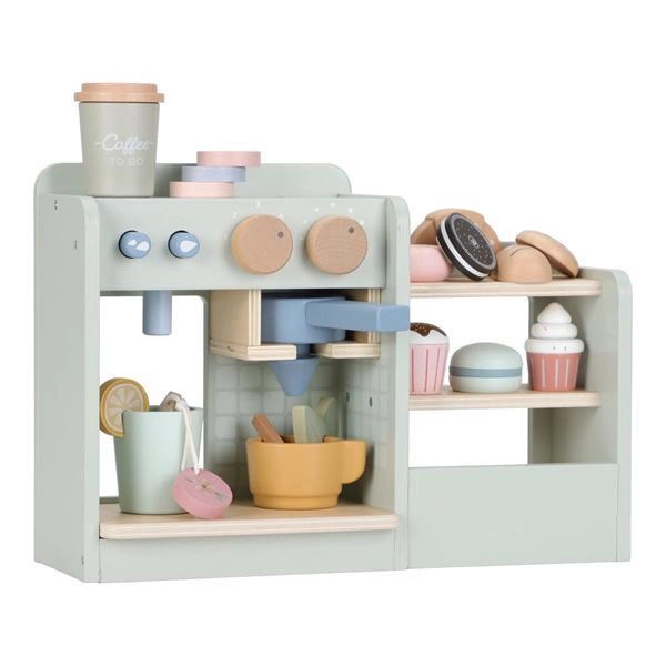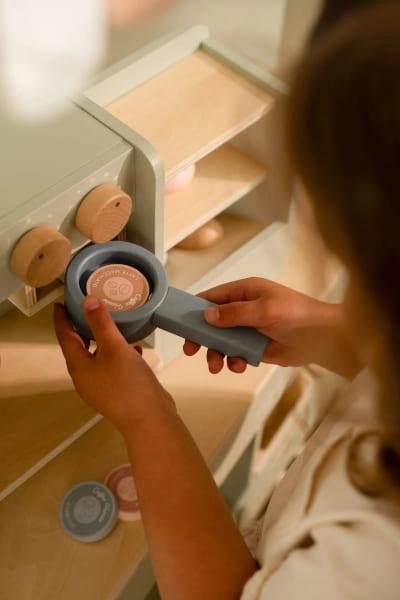 Dzięki drewnianej kawiarence Twoje dziecko zamieni się w prawdziwego baristę. Z tym uroczym zestawem Ty i Twoje dziecko możecie mieć Waszą ulubioną kawiarnię w swoim domu. Twoje dziecko z przyjemnością przygotuje pyszne napoje i ciasteczka na miejscu i na wynos. W kąciku kawowym znajduje się ekspres do kawy i herbaty, schowek na wszystkie kubki i inne niezbędne artykuły, witryna na przekąski oraz tablica z menu. Liczne akcesoria, takie jak rogaliki, pączki, torebki z herbatą i naboje z różnymi rodzajami kawy zapewnią wiele godzin cudownej zabawy.