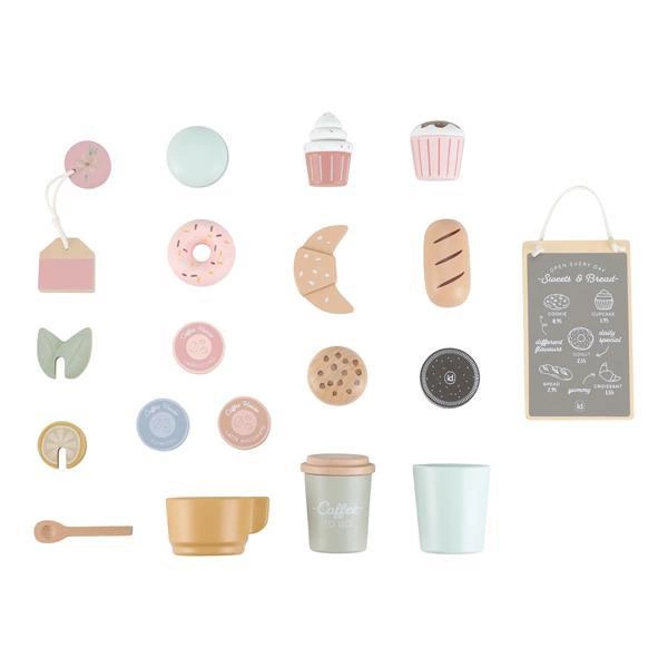 Kawiarenka i wszystkie akcesoria (19 sztuk) wykonane są z drewna z certyfikatem FSC i pokryte bezpieczną farbą na bazie wody w uroczych, pastelowych kolorach. Zabawka pobudza kreatywność i zdolności motoryczne oraz pozwala dzieciom uwolnić wyobraźnię. Świetnie sprawdzi się jako uzupełnienie do Dużej kuchni pastelowej, Dużego drewnianego tortu urodzinowego lub Tostera z akcesoriami. Kawiarenka to doskonały pomysł na prezent dla każdego trzylatka.