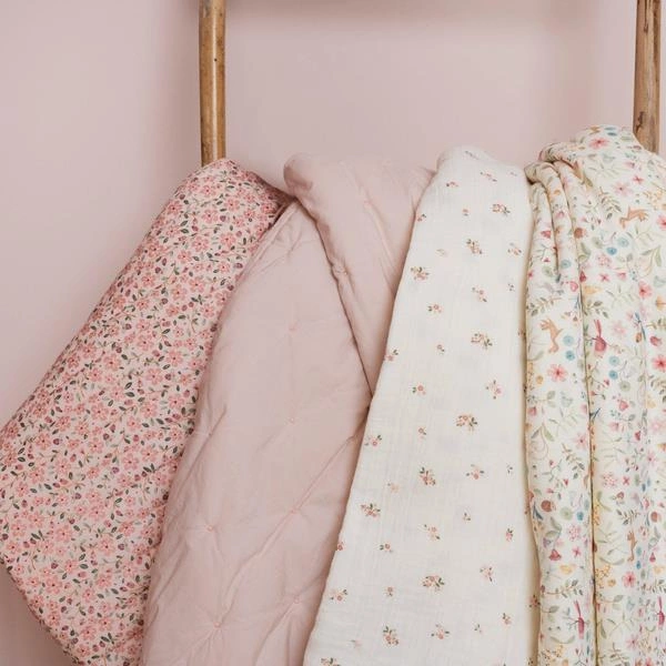 Kocyk 110x140 cm Blossom od Little Dutch. Miękki pikowany kocyk, który zapewnia dziecku cudowne ciepło i komfort. Dzięki miękkiej pikowanej bawełnie z jednej strony, z wyhaftowanymi kropkami, oraz przyjemnej tkaninie interlock z drugiej, może być używany jako kocyk do łóżeczka, narzuta lub mata do zabawy. Delikatny różowy kolor Blossom wnosi do pokoju dziecięcego przytulność i spokój, a także pięknie łączy się z innymi produktami z kolekcji Fairy Garden.