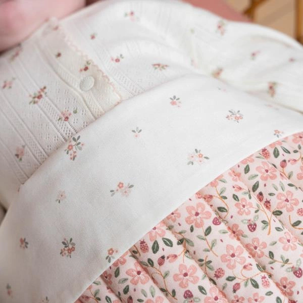 Kocyk 110x140 cm Fairy Floral & Fairy Blossom od Little Dutch. Piękny kocyk, który zapewni dziecku cudowne ciepło i przytulność podczas snu. Wykonany z bawełny organicznej i ozdobiony subtelnymi pikowanymi paskami w nowoczesnym stylu. Delikatnie wypełnienie dodaje mu miękkości. Kocyk jest dwustronny - można wybrać subtelny nadruk Fairy Blossom z jasną tkaniną usianą małymi kwiatami lub różową kwiatową stronę Fairy Floral. Idealny wybór do pokoju maluszka. Kocyk pięknie łączy się z innymi produktami z kolekcji Fairy Garden.