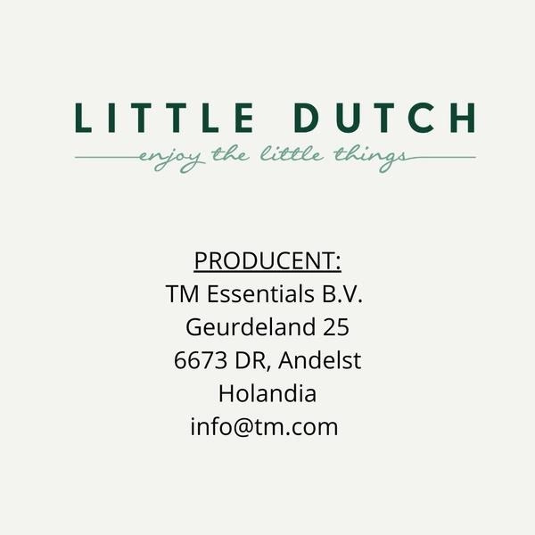 Little Dutch to holenderska firma rodzinna, prowadzona przez małżeństwo, które wkłada całe serce w tworzenie produktów dla najmłodszych. W ofercie marki znajdują się doskonałej jakości tekstylia, produkowane z bawełny organicznej z certyfikatem Oeko-tex, takie jak ręczniki, śpiworki do spania, otulacze, akcesoria do pokoików dziecięcych oraz zabawki sensoryczne dla niemowląt, jak również zabawki czy pojazdy wytwarzane z drewna. Produkty Little Dutch cechuje spokojna, pastelowa kolorystyka.