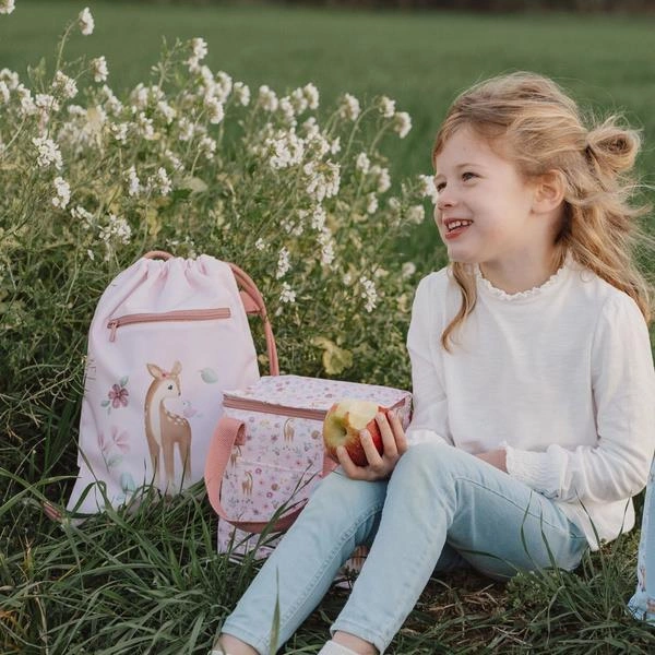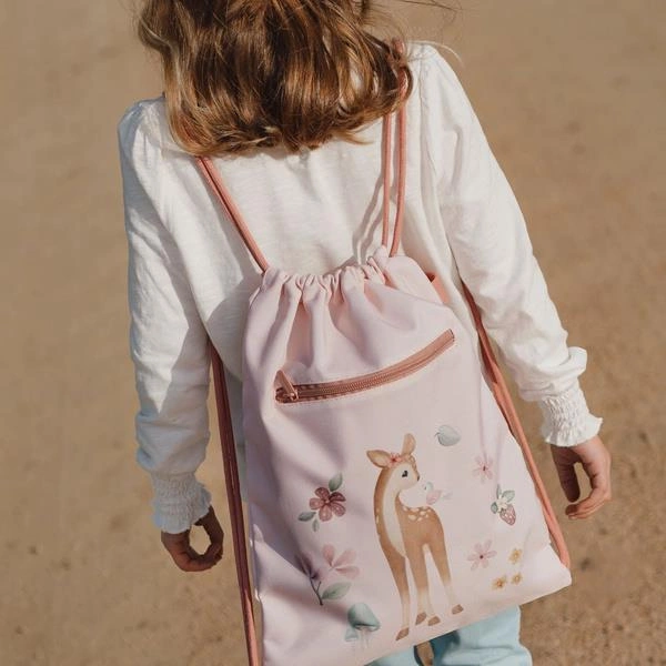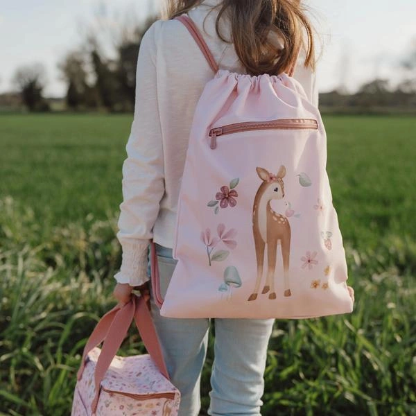 Worek sportowy Fairy Garden od Little Dutch. Stylowy i funkcjonalny worek z sarenką i motywami kolekcji Fairy Garden idealnie się sprawdzi do zabrania wszystkich niezbędnych rzeczy do przedszkola, na wycieczkę lub zajęcia sportowe. Dzięki podwójnemu ściągaczowi można go wygodnie nosić jako plecak, a pętelka do zawieszenia zapewnia dodatkową wygodę. Z przodu znajduje się niewielka kieszonka zamykana na suwak, a w środku etykieta do wpisania danych dziecka. Stanowi doskonałe uzupełnienie do pozostałych produktów z kolekcji Fairy Garden.