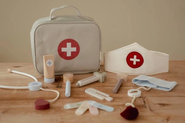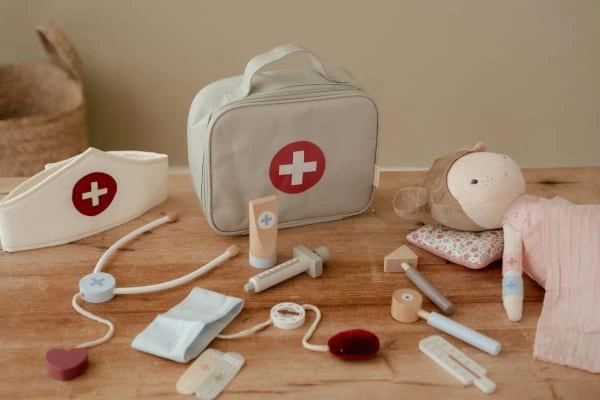 Zestaw lekarski do zabawy dla dzieci to fantastyczny pomysł na ciekawe zabawy, które dzieci uwielbiają. Zestaw zapakowany jest w bardzo ładną kosmetyczkę-walizeczkę, a w środku znajdziemy 4 plastry, termometr, strzykawka, tubka maści, stetoskop, młotek refleksyjny, ciśnieniomierz, otoskop i czapka lekarska. Bardzo duży i ciekawy zestaw, zapewni długie godziny tak uwielbianej przez dzieci zabawy jak ta w lekarza.