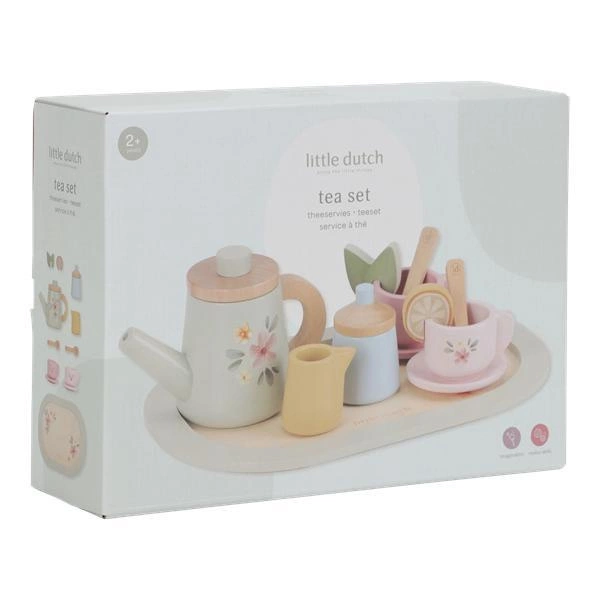 Drewniany zestaw Tea set do herbaty od Little Dutch. Kto nie lubi przyjęcia herbacianego? Dzięki temu uroczemu drewnianemu zestawowi do herbaty, Twój maluch może serwować pyszne filiżanki herbaty i gościć swoich przyjaciół. Zestaw składa się z: czajniczka, dzbanka na mleko, cukierniczki, dwóch filiżanek ze spodkiem i łyżeczkami oraz drewnianej tacy. Bardzo ładnie wykonany, malowany bezpiecznymi farbami na bazie wody. Doskonały pomysł na prezent.
