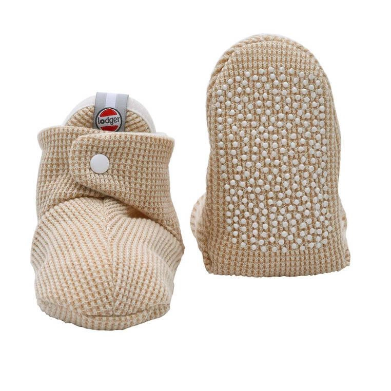 Buciki z dzianiny o waflowym splocie holenderskiej marki Lodger zapewniają małym nóżkom wygodę i ciepło. Idealne do wózka, np. na czas przebywania na świeżym powietrzu, a także do stawiania pierwszych kroczków w domu. Są leciutkie, oddychające, rozciągliwe i komfortowe. Krój bucików, wzorowany na skarpetkach nad kostki sprawia, że doskonale chronią one stópki. Mają wygodny, nieco wydłużony języczek i zapięcie na dwa solidne zatrzaski, dzięki któremu utrzymują się na miejscu. Posiadają też antypoślizgowe silikonowe wypustki na całej powierzchni podeszwy.
