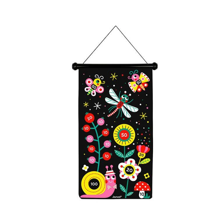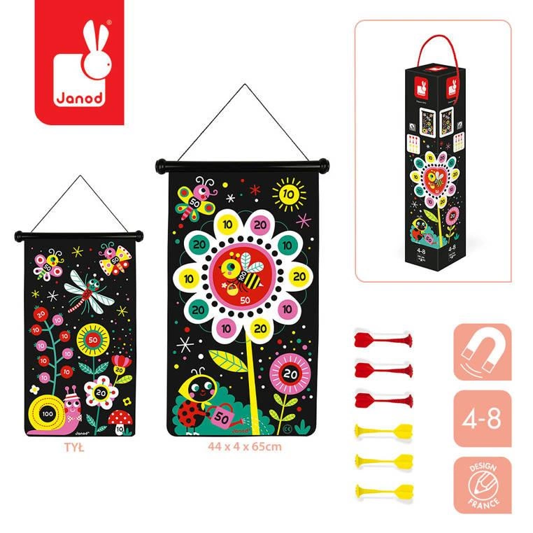 Magnetyczna gra w rzutki Ogród francuskiej marki JANOD to wspaniała zabawa dla dwojga – zarówno dzieci, jak i ich rodziców. Zestaw składa się ze zwijanej na rolkę tarczy ze sznurkiem do jej zawieszenia np. na ścianie oraz z 6 magnetycznych rzutek w dwóch kolorach (3 czerwone i 3 żółte). Czarna tkanina tarczy ilustrowana jest dwustronnie kolorowymi motywami kwiatów i owadów. Rzutkami należy celować w tarczę z odpowiedniej, ustalonej przez graczy odległości, w taki sposób, by trafić w oznaczone na niej punktowane miejsca. Celem gry jest zgromadzenie w trzech rzutach jak największej ilości punktów. Gracz, któremu się to uda, wygrywa. Gra ta ćwiczy koncentrację i zręczność.