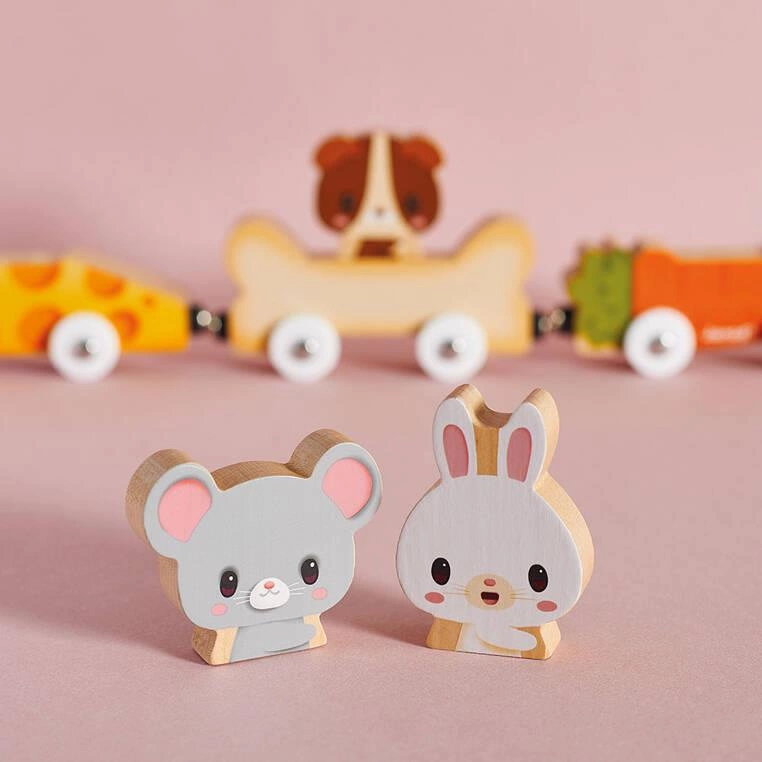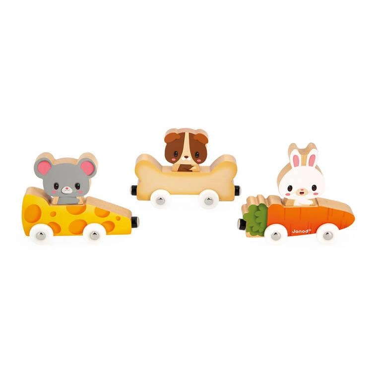 Zestaw drewnianych magnetycznych pojazdów ze zwierzątkami domowymi z kolekcji Farma francuskiej marki JANOD składa się z 3 autek o nietypowych kształtach: w marchewce podróżuje królik, w kosteczce – piesek, a w kawałku sera – myszka. Pojazdami można się bawić osobno lub łączyć je ze sobą dzięki magnesom, a zwierzątka można przesadzać (także trzymają się na magnes). Są poręczne, mają ładne kolory i niebanalny design. Zabawka została zaprojektowana we Francji. Zapakowana jest w estetyczne kartonowe pudełko. Idealnie nadaje się na prezent.