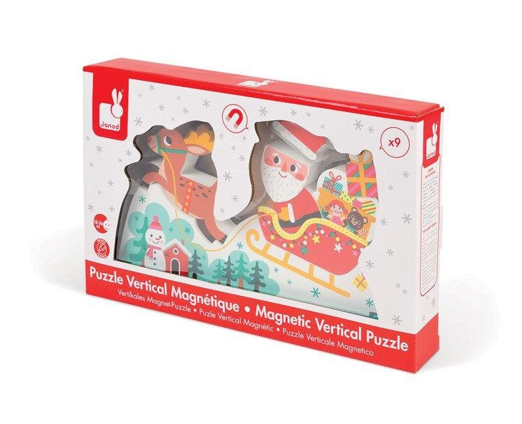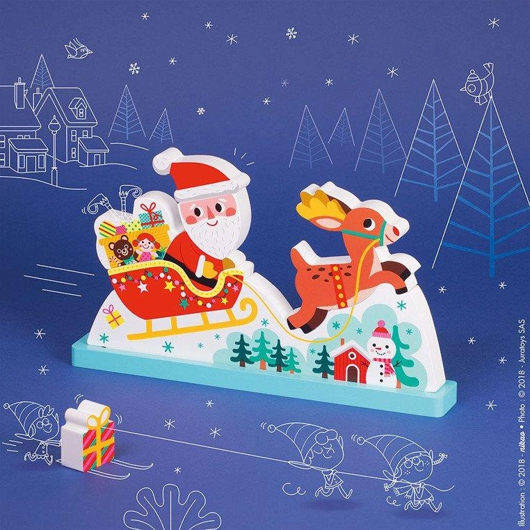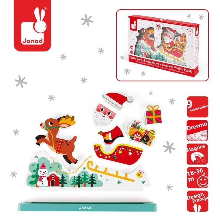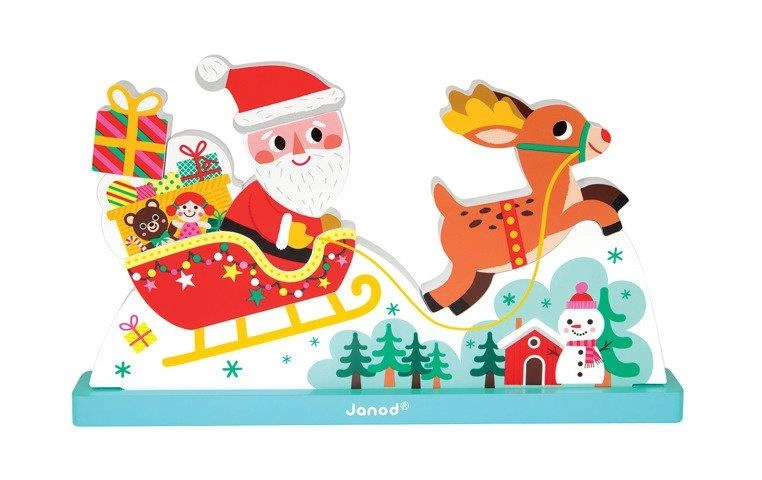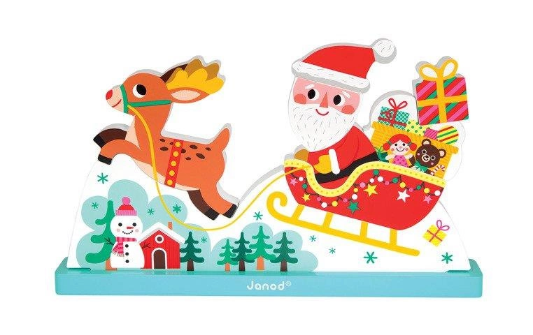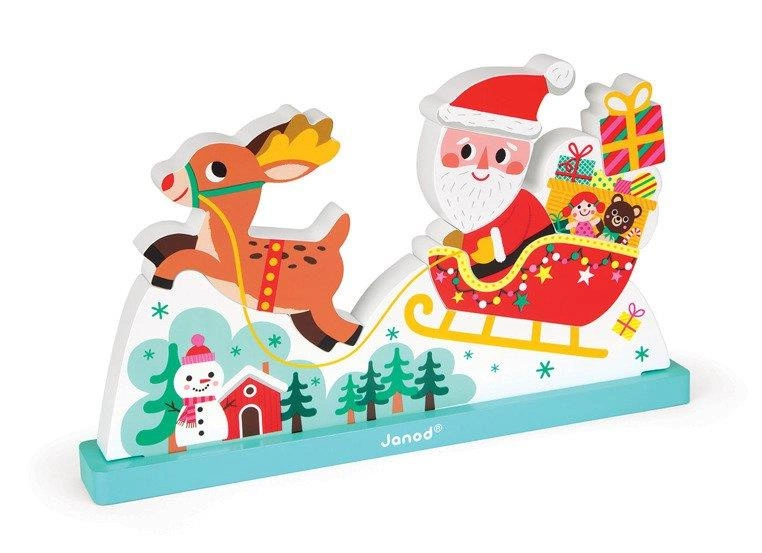 Św. Mikołaj mknący w pełnych prezentu saniach, zaprzęgniętych w czerwononosego renifera, to niewątpliwy symbol Świąt Bożego Narodzenia. Dostępny w wersji przestrzennych klocków, które dziecko może ze sobą łatwo połączyć z pomocą magnesów. Wykonane z drewna, z grafiką z obydwu stron. Pakowane w pudełko z okienkiem.