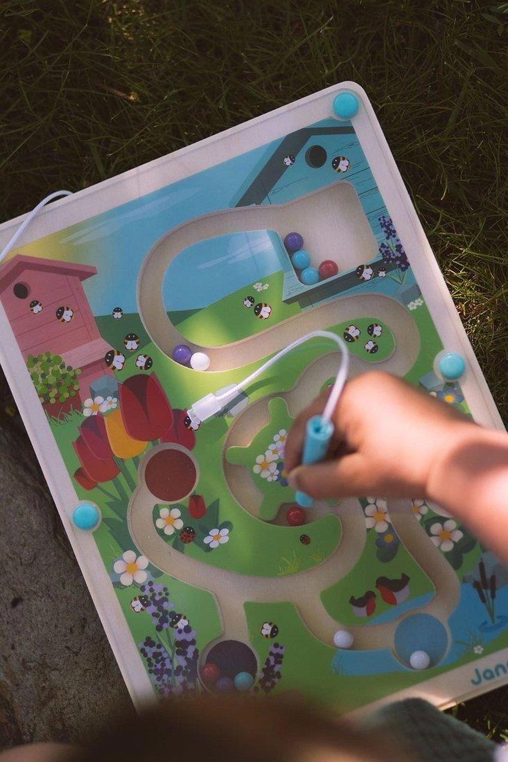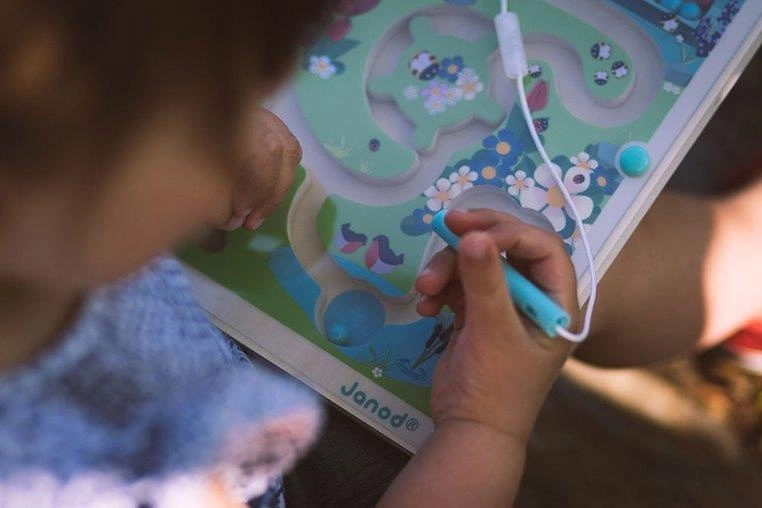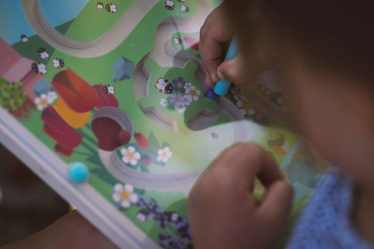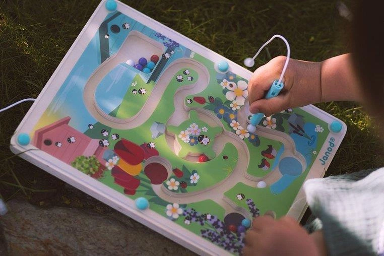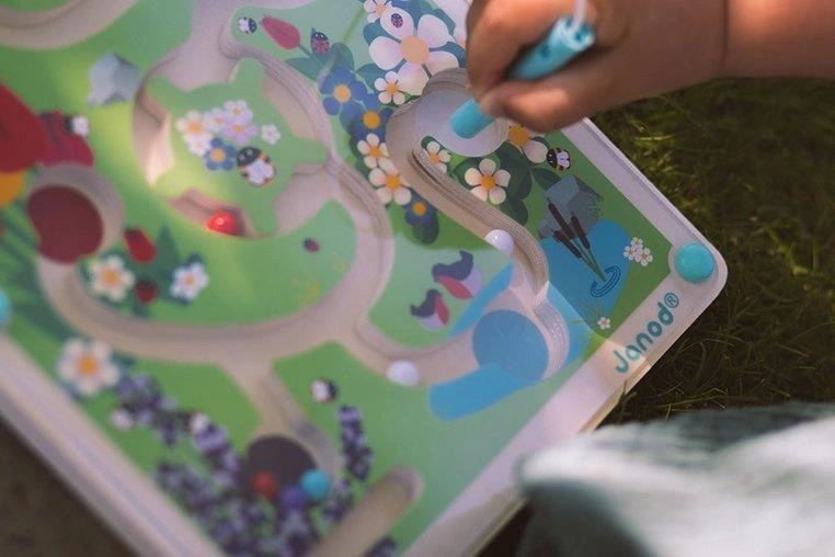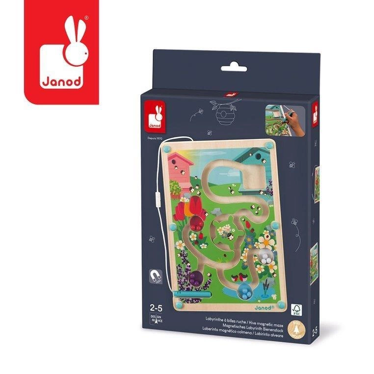 Magnetyczny labirynt Rój francuskiej marki JANOD to doskonała zabawka manipulacyjna dla małych dzieci, która rozwija m.in. chwyt i koordynację ręka-oko. Labirynt korytarzy znajduje się na drewnianej planszy z grafiką ukwieconej łąki i uli, za bezpieczną plastikową szybką. Zabawa polega na przesuwaniu drewnianych kulek za pomocą drewnianego patyczka zakończonego magnesem. Patyczek umieszczony jest na sznurku przy planszy, a pod szybką znajduje się również miejsce na schowanie go. Kulek jest w sumie 12 – po 3 kulki w 4 różnych kolorach (białe, niebieskie, czerwone i fioletowe). Zadaniem malca jest poprzesuwać je w miejsca, odpowiadające im kolorem (tam, gdzie rosną czerwone maki, fioletowa lawenda, białe rumianki i gdzie jest jeziorko z niebieską wodą), a następnie – odprowadzić do ula. Po drodze kulki muszą jeszcze pokonać przeszkodę w postaci obracanego zębatego koła. Zabawka jest pięknie wykonana, co dodatkowo zachęca dziecko do podjęcia wyzwania. To także świetny sposób na zapoznanie dziecka ze zwyczajami i rolą pszczół w przyrodzie.
