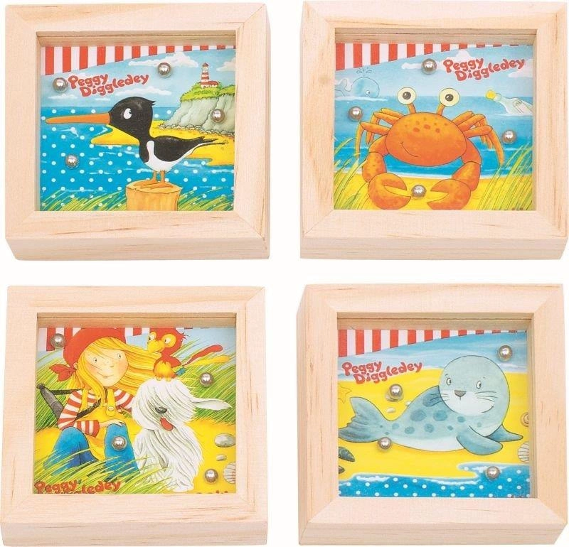Zręcznościowa gra drewniana Wakacje Peggy Digglede polega na trafieniu kuleczkami w otwory. Gra została tak skonstruowana, że nie ma możliwości by kuleczki wypadły, więc nic się nie pogubi. Grę umila również wesoły motyw Peggy Diggledey umieszczony w tle. Ta niepozorna gra potrafi naprawdę wciągnąć. Świetnie sprawdzi na wakacjach. Gra wykonana jest z drewna z dbałością o każdy szczegół, dzięki temu dostarczy Twojemu dziecku wielu świetnych godzin zabawy.