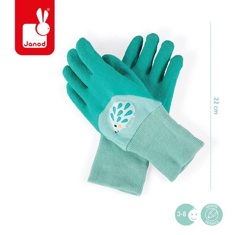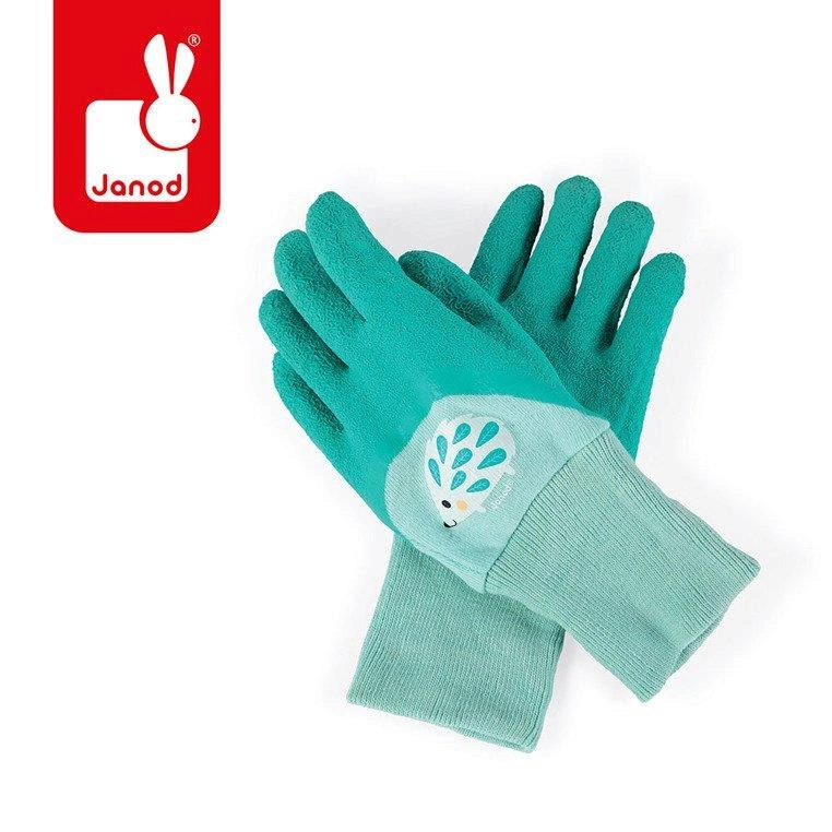 Rękawiczki dziecięce do prac ogrodowych z serii Mały ogrodnik francuskiej marki JANOD to idealna zabawka dla dziecka, lubiącego aktywność w ogrodzie i naśladowanie dorosłych. Rękawiczki są wykonane z bawełny, wygodne, z miękkim gumowaniem, dzięki któremu nie przemakają i długimi ściągaczami, które zapewniają małym rączkom odpowiednią ochronę podczas zabawy. Mają turkusowo-jasnoniebieski kolor i motyw uroczego jeżyka. Są bardzo wytrzymałe i estetycznie wykonane. Idealnie nadają się na prezent.