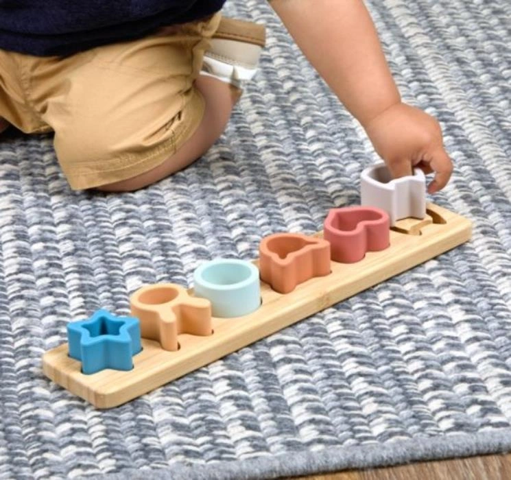 Bambusowy sorter kształtów z kolekcji Simply Silicon marki Mary Meyer łączy prosty, minimalistyczny design z subtelną paletą barw inspirowaną naturą. Wykonany z gładkiego bambusa oraz miękkiego, elastycznego silikonu, jest całkowicie pozbawiony ostrych krawędzi, dzięki czemu zapewnia najmłodszym bezpieczną i przyjemną zabawę.