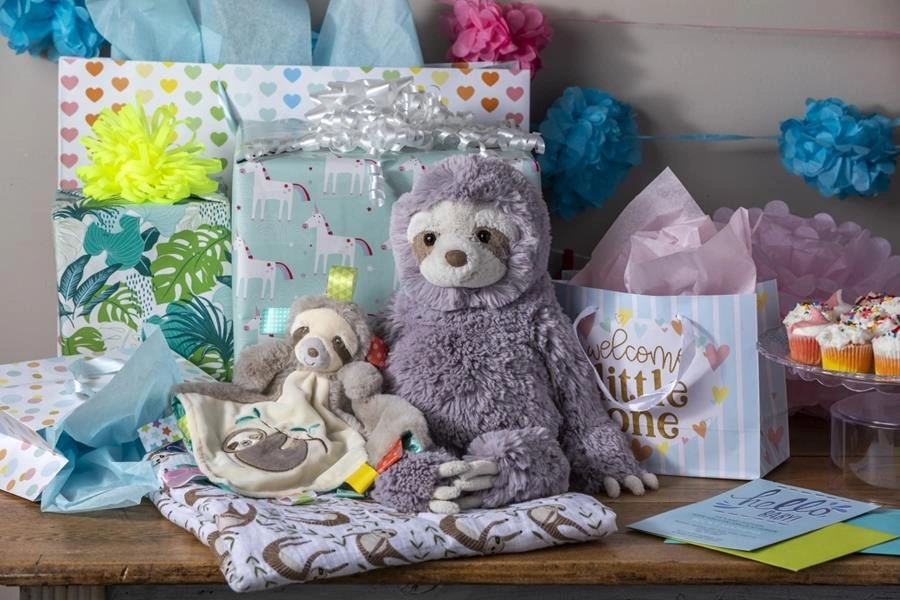 - Miękki kocyk z maskotką leniwcem i satynowymi metkami.