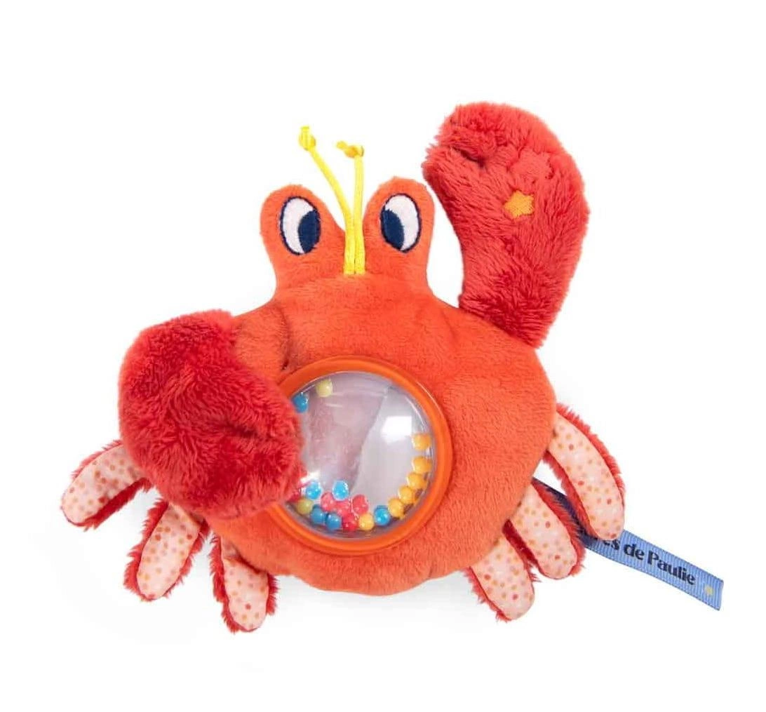 Maskotka grzechotka w kształcie kraba zawiera ciekawe elementy do odkrycia.