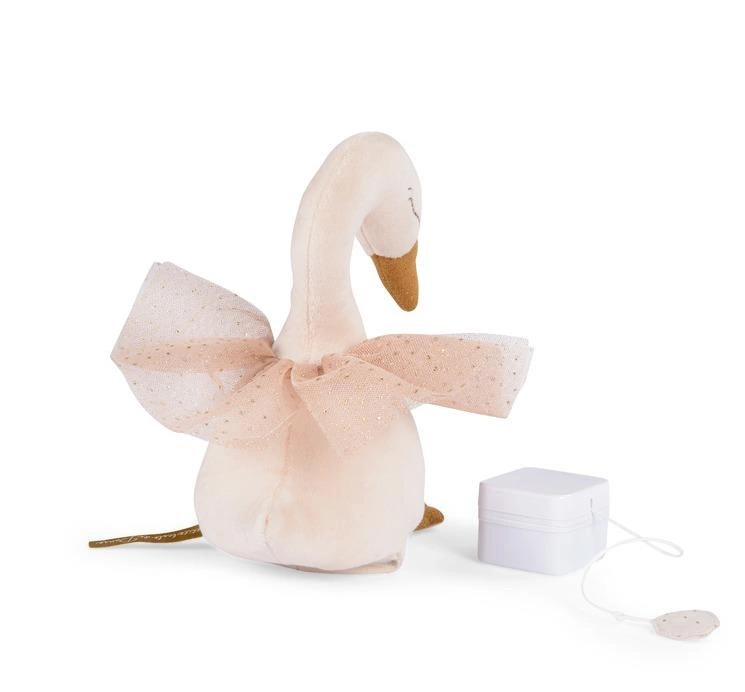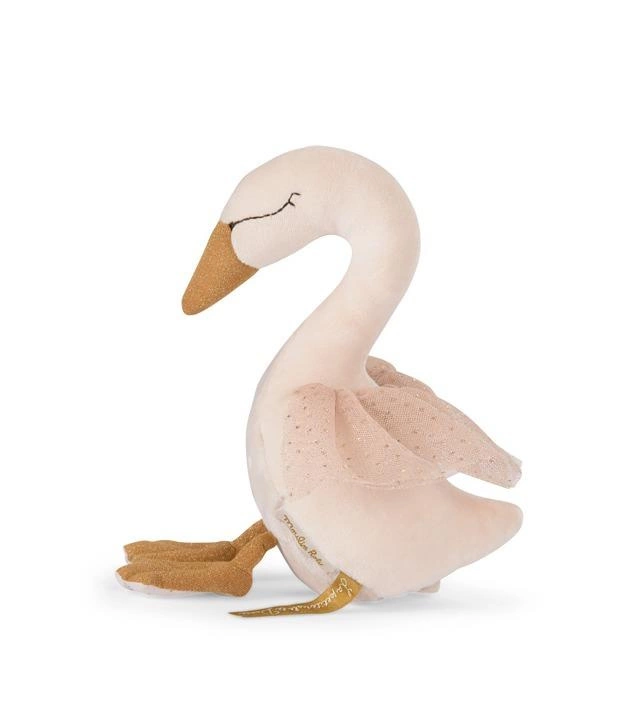 Maskotka mały łabędź z pozytywką z kolekcji La Petite École De Danse francuskiej marki Moulin Roty. Pociągnij za uchwyt i ukołysz maluszka do snu delikatną melodią. Ten uroczy łabędź przyozdobiony cekinowym tiulem może stanowić piękną ozdobę dziecięcego pokoju. Ustawiony w pozycji siedzącej, będzie strzec spokojnego snu maluszka.