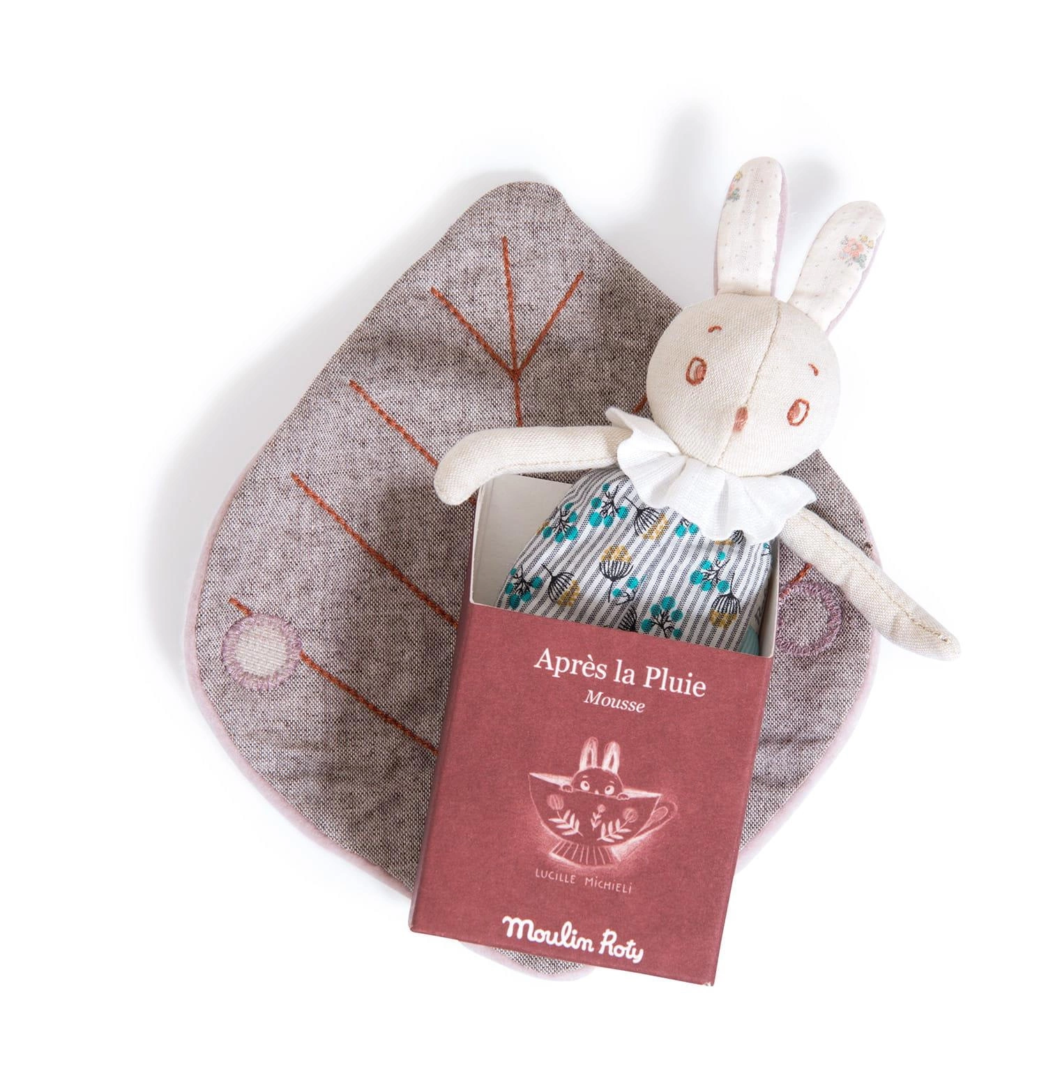 Maskotka z serii „Po deszczu” to kolekcja stworzona przez Lucille Michieli, stylistkę kolekcji Les Parisiennes. Zainspirowane wspomnieniami z dzieciństwa i japońskimi rysunkami, postacie są słodkimi małymi stworzeniami, które przyszły schronić się w pokoju dziecka po spacerze w lesie. Te małe towarzyszki zabaw z haftowanymi twarzami i dużymi uszami z polaru mają na sobie ubrania z lnu i bawełny organicznej. Oto Mousse, mały królik w pasiastym kombinezonie z kremowym kołnierzem. Mus jest owinięty różowym liściem z polaru. Każde maleństwo pokocha Mousse, jest w idealnym rozmiarze do przytulania i będzie wiernym towarzyszem dziecka.