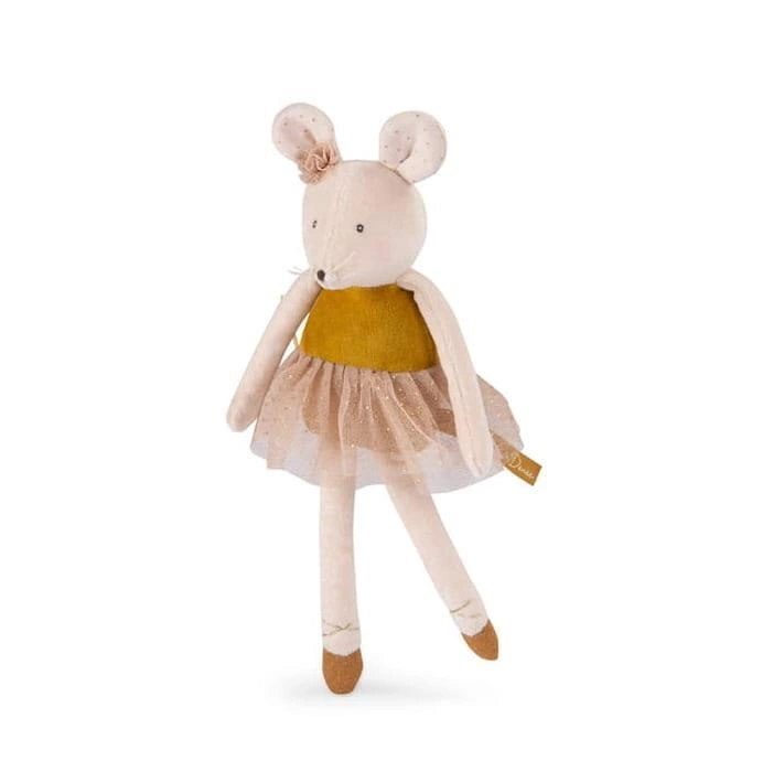Przeurocza mała myszka szykuje się na swój pierwszy pokaz baletu. Prezentuje się bardzo elegancko, dzięki delikatnie pudrowanym policzkom i kokardce przy uchu. Maskotka z kolekcji Mała Szkoła Tańca ubrana jest w złotą bluzeczkę, tiulową spódniczkę tutu w groszki i baletki. Jej słodka buźka zachęci do zabawy lub utuli do snu każdego maluszka.