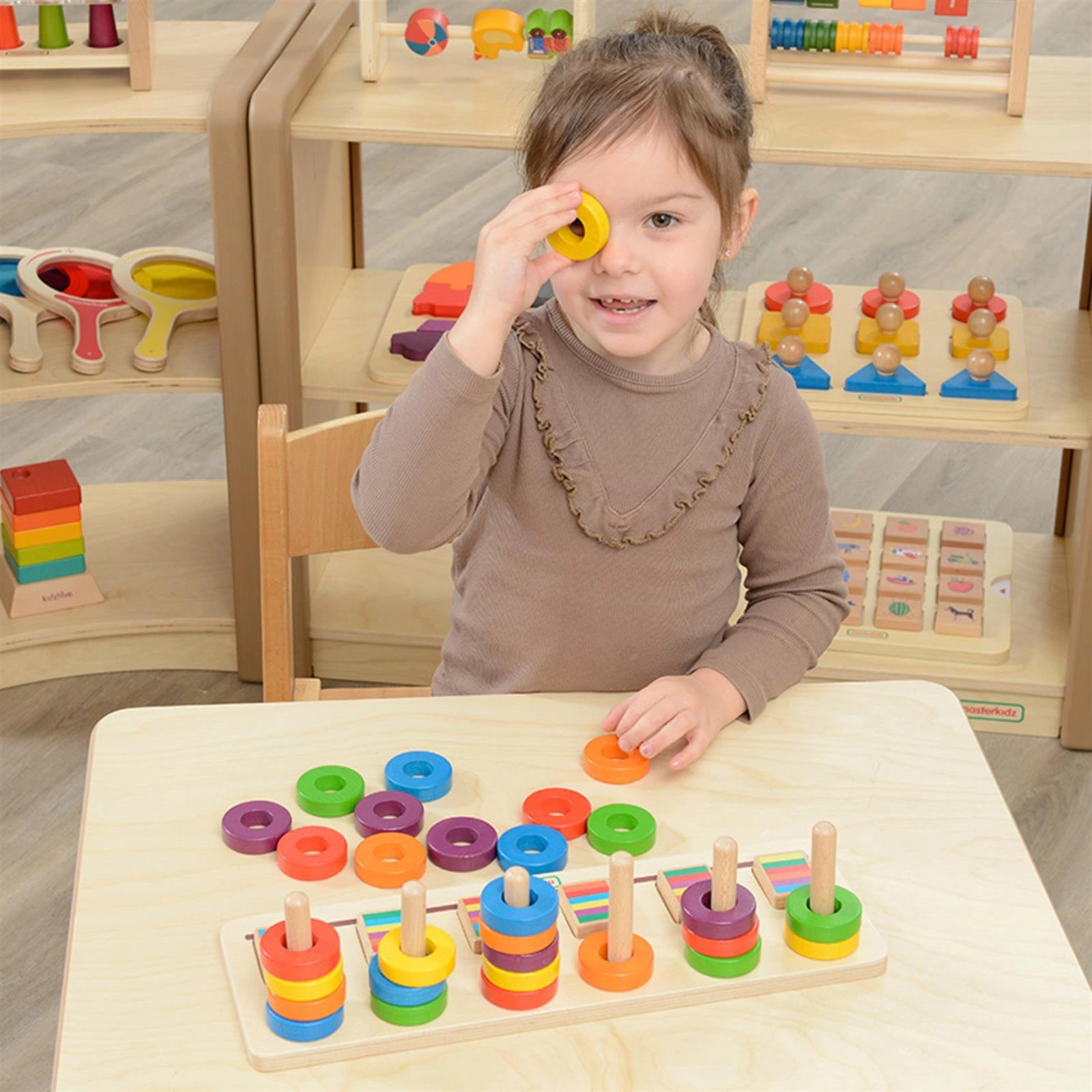 Ta tablica edukacyjna to świetnaukładanka sekwencyjna dla dzieci od 2. roku życia. Zestaw zawiera6 zestawów kolorowych pierścieni, które można wykorzystywać do zabawy,nauki kolorów, sortowania i sekwencjonowania. Dzieci mogą układać pierścienie w określonej kolejności lub tworzyć własne sekwencje. Przestrzenie przed prętami umożliwiają układanie bloków sekwencji, co stanowi wyzwanie i rozwija koncentrację, świadomość przestrzenną, logiczne myślenie oraz umiejętność rozpoznawania kolorów.