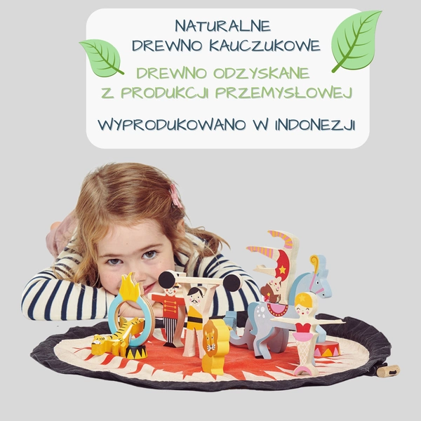 Zestaw drewnianych cyrkowych figurek w płócienne torbie, która po rozłożeniu zamienia się w prawdziwą scenę! Występuj i pokazuj sztuczki za pomocą drewnianych figurek. Idealna zabawka do zabrania w podróż lub w odwiedziny! Wystarczy zapakować wszystkie elementy do woreczka!