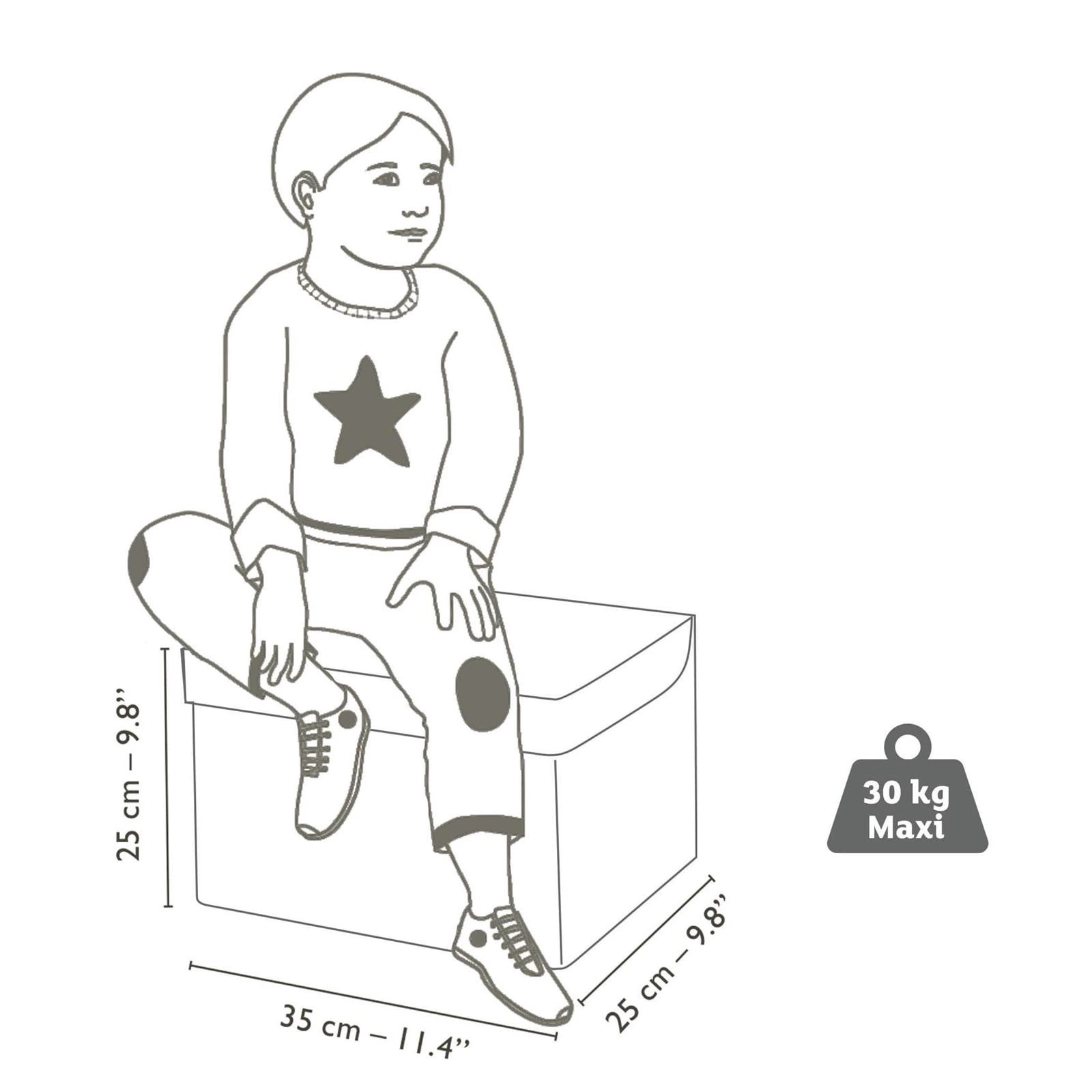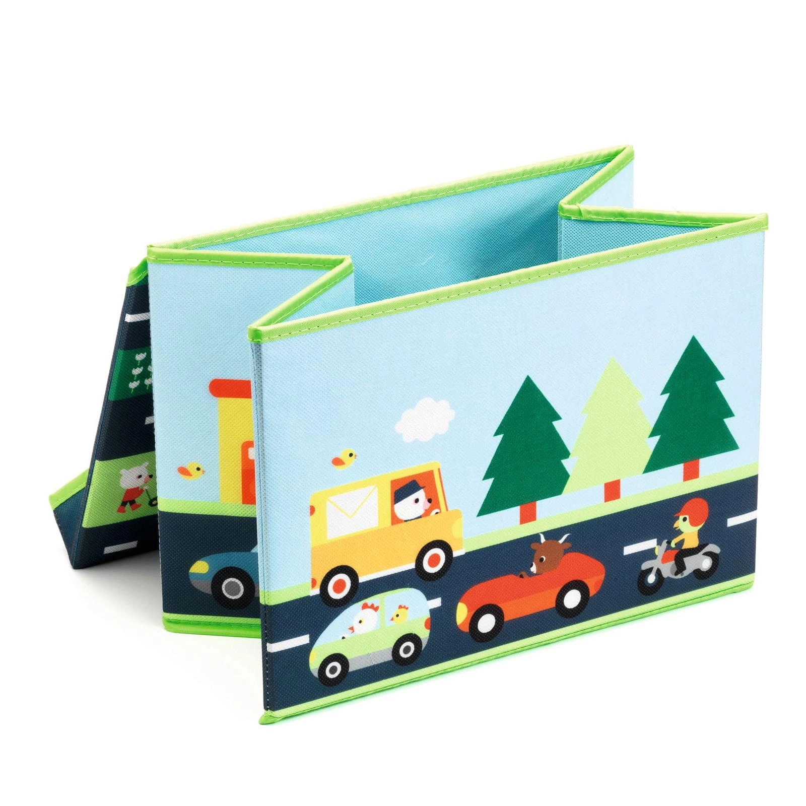 Materiałowe pudełko 2 w 1: do przechowywania lub zabawy autkami. Skrzynia posiada solidny stelaż wykonany z płyty MDF, a na materiale nadruk z ulicami i wizerunkami samochodów, dzięki czemu można bawić się w odgrywanie ról. Przygotuj swoje autka, aby przenieść się do wyimaginowanego miasteczka. Pudełko można rozłożyć na płasko. Bardzo łatwy montaż. Wytrzymuje obciążenie do 30 kg.