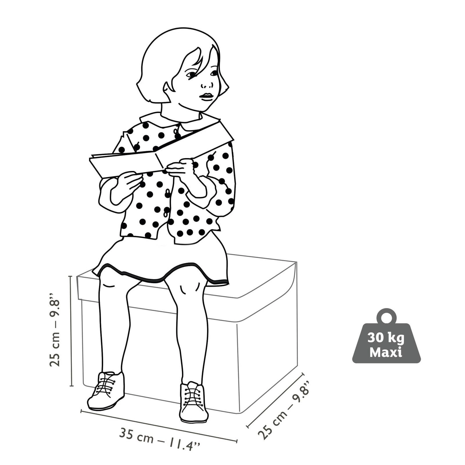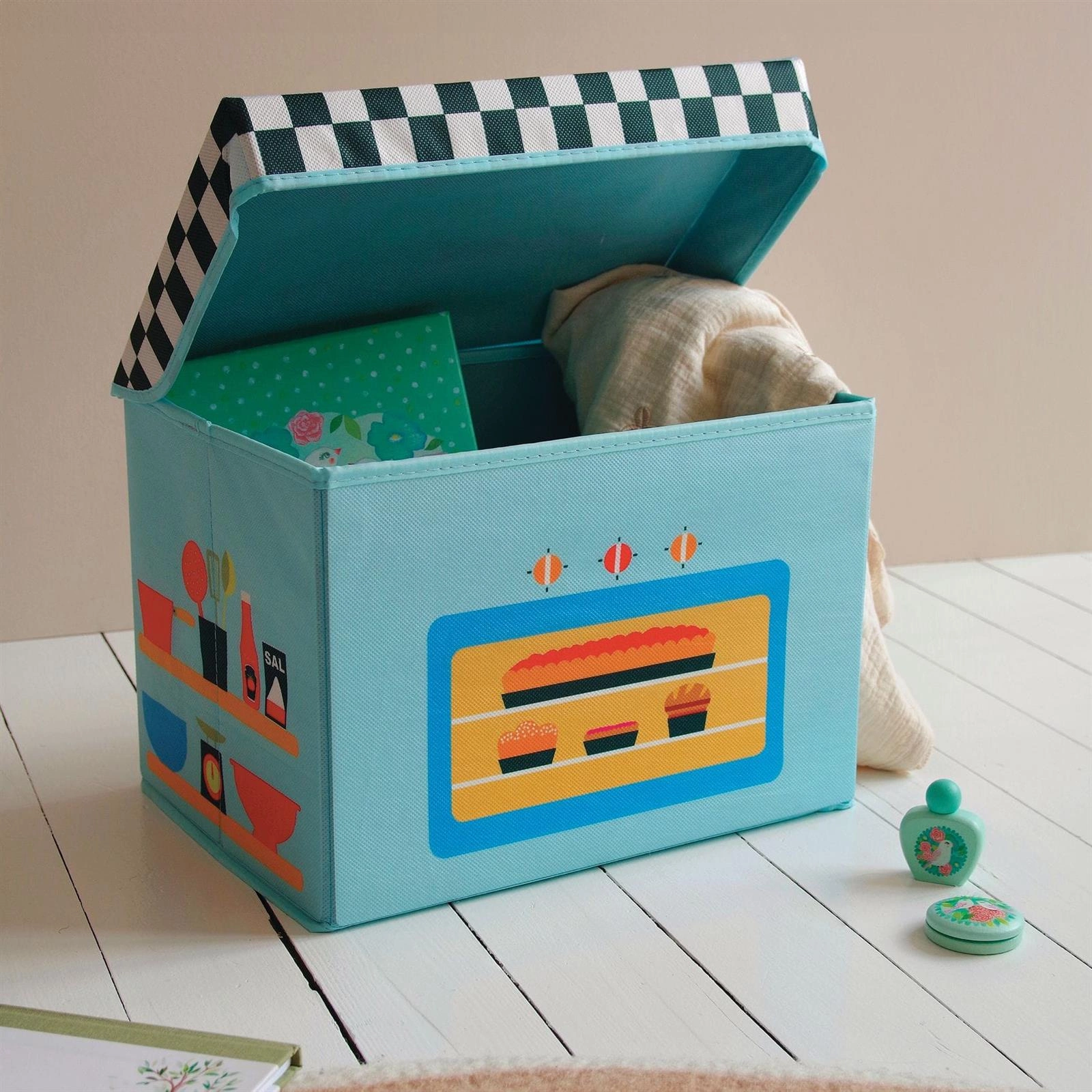 Materiałowe pudełko 2 w 1: do przechowywania lub zabawy w gotowanie. Skrzynia posiada solidny stelaż wykonany z płyty MDF, a na materiale nadruk imitujący kuchenkę, dzięki czemu można bawić się w odgrywanie ról. Przygotuj swoje zabawkowe garnki i patelnie, aby przenieść się do wyimaginowanej kuchni. Pudełko można rozłożyć na płasko. Bardzo łatwy montaż. Wytrzymuje obciążenie do 30 kg.