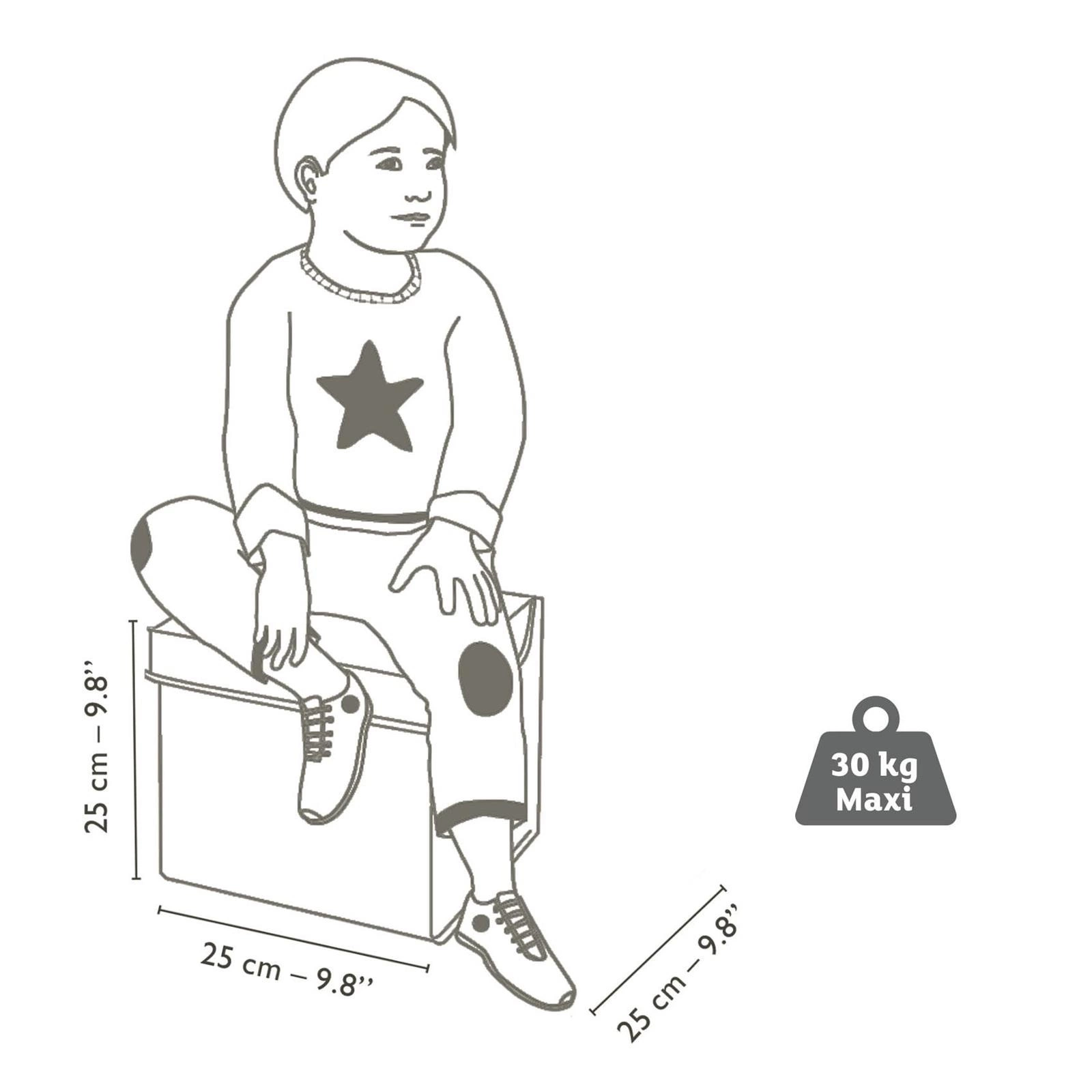 Materiałowe pudełko 2 w 1: do przechowywania dziecięcych skarbów, będący jednocześnie siedziskiem. Skrzynia posiada solidny stelaż z płyty MDF, dzięki czemu dziecko może bezpiecznie na niej usiąść. Wytrzymuje obciążenie do 30 kg. Na materiale znajduje się kolorowy nadruk z superbohaterami, będący piękną ozdobą dziecięcego pokoju. Pudełko pomieści wszystkie najważniejsze skarby. Pudełko można rozłożyć na płasko. Bardzo łatwy montaż.