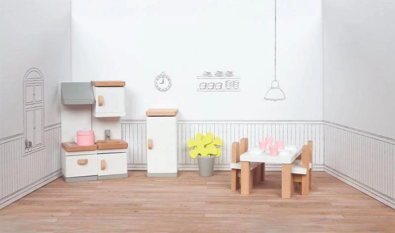 Zabawa w dom i odgrywanie różnego rodzaju wydarzeń z dnia codziennego to bardzo kreatywna rozrywka. Tło każdej sceny ma znaczenie, wzbogaca pomieszczenia o niezbędne detale i nadaje całości realizmu. Komplet drewnianych mebelków pozwoli na dokładną aranżację kuchni i jadalni. Zestaw doskonale sprawdzi się w każdym domku dla lalek marki goki. Dodatki takie jak kubeczki, garnek czy roślinka w doniczce sprawiają, że zabawa będzie jeszcze ciekawsza.