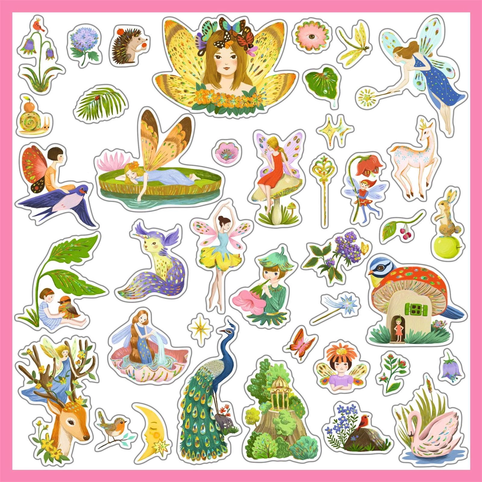 Zestaw 160 metalicznych naklejek o tematyce baśniowej: wróżki, jednorożce, elfy... Naklejki mogą ozdobić różne przedmioty, rysunki lub służyć do tworzenia własnych opowieści i baśni. 2 różne arkusze naklejek, każdy w 2 kopiach, aby móc  ponownie użyć ulubionych postaci. Wykonane z papieru i kartonu posiadającego certyfikat FSC®.