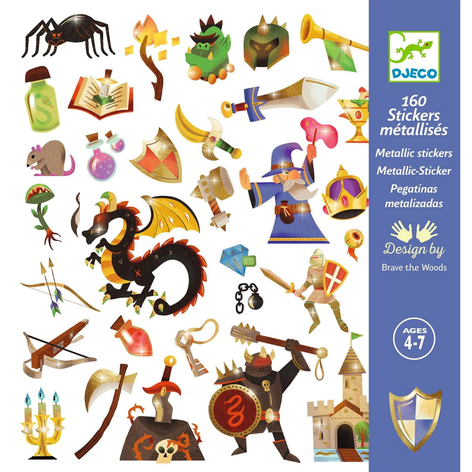 Zestaw 160 naklejek z metalicznym wykończeniem przedstawiający postacie i przedmioty inspirowane średniowieczem. Ozdabiaj przedmioty, rysunki lub twórz własne historie i baśnie za pomocą czarodziei, rycerzy lub smoków! 2 różne arkusze naklejek, każdy w 2 kopiach, aby móc ponownie użyć ulubionych postaci. Metaliczne wykończenie nadaje dodatkowego uroku. Naklejki wykonane są z papieru i kartonu posiadającego certyfikat FSC®.