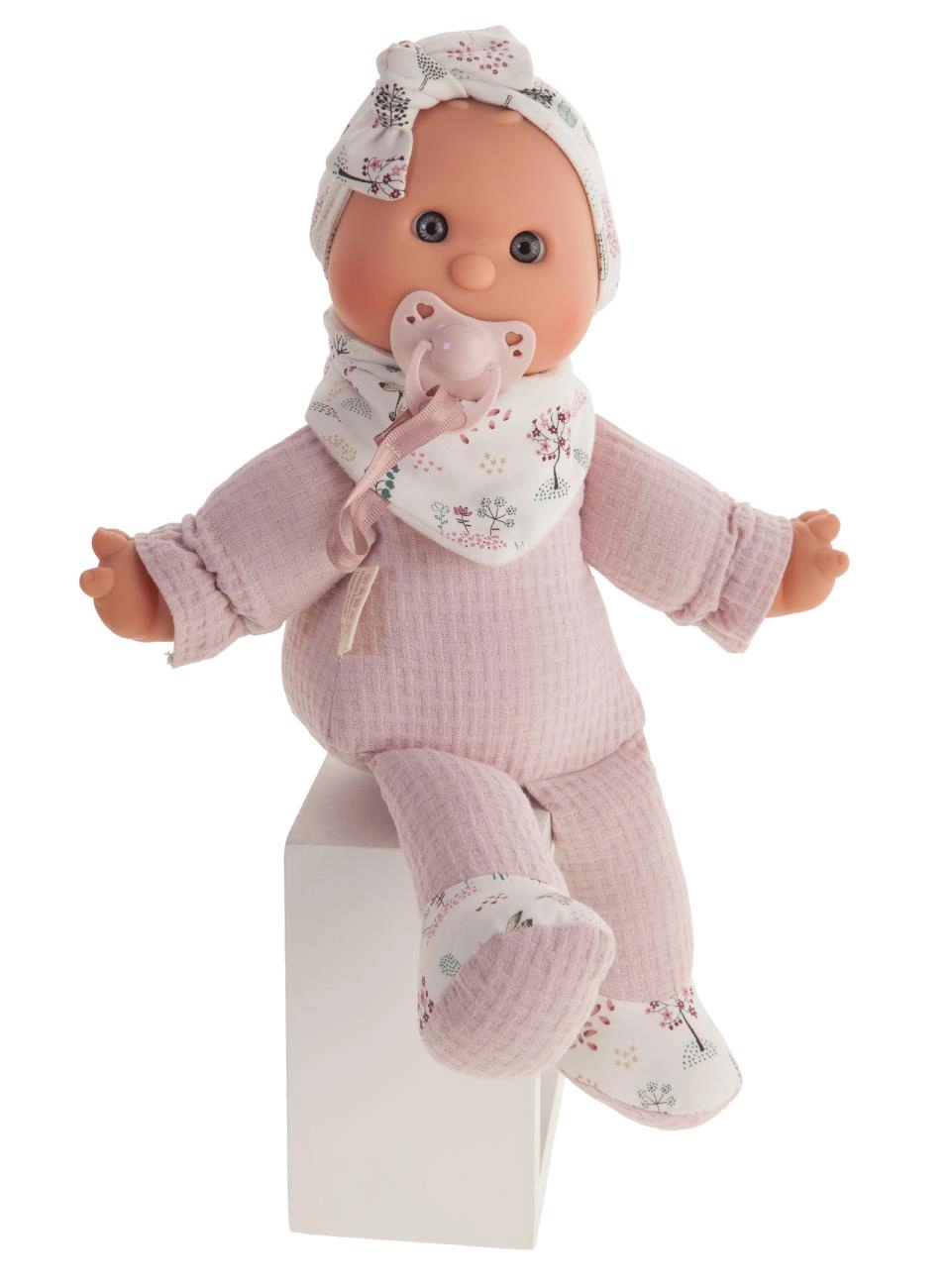 Szmacianą laleczkę producent wyposażył w białe dodatki ozdobione motywem w kolorowe kwiaty. Dziewczynka ma przy sobie różowy smoczek na materiałowej tasiemce bezpośrednio przyszytej do tułowia dziewczynki. Akcesorium wyposażone w magnez, dzięki któremu dodatek doskonale dopasowuje się do drobnej buzi dziewczynki. Zestaw wyposaży również śliniaczek zapinany z tyłu na rzepę. Natomiast główkę dziewczynki zdobi biała opaska udekorowana dużą kokardką. Tułów oraz nóżki dziewczynki zostały obszyte różowym materiałem z wypukłą fakturą, a na zakończeniach drobnych stópek zostały zawarte białe materiałowe wstawki ozdobione kolorowym motywem kwiecistym.