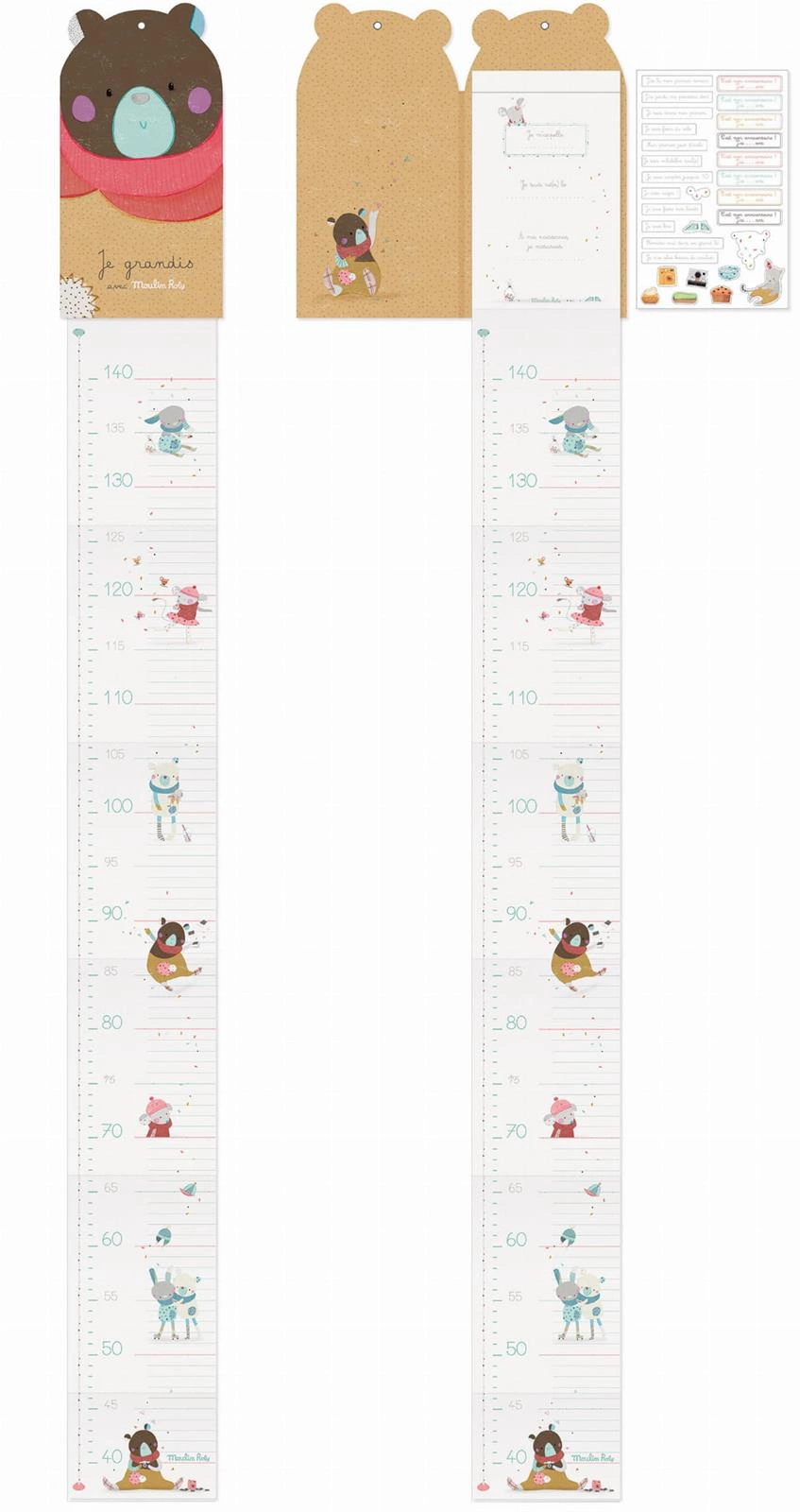 Miarka wzrostu z kolekcji Les Jolis Trop Beaux od Moulin Roty czuwa nad rozwojem twojego maleństwa! Miarka jest w formie "notatnika" - otwiera się i rozkłada aby mierzyć wzrost od 40 cm do 1,40 m. Za pomocą wielu naklejek można zaznaczyć i zapamiętać ważne chwile swojego malucha: "Umiem napisać swoje imię", "Umiem jeździć na rowerze", "Umiem pływać" itp. Przydatna dekoracja dziecięcego pokoju.