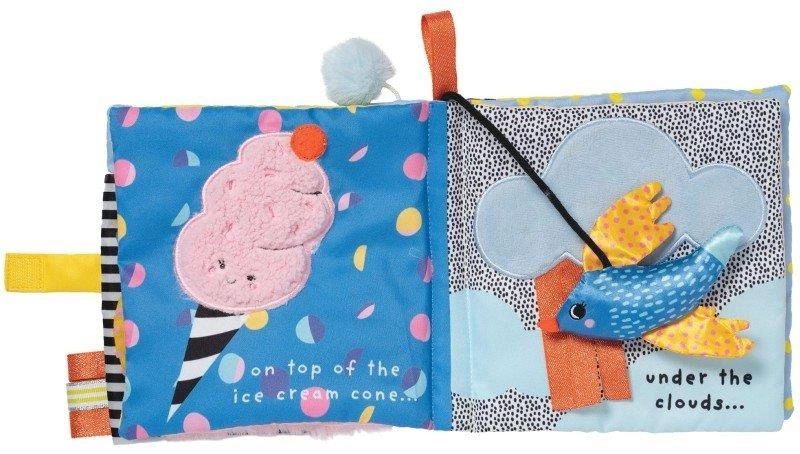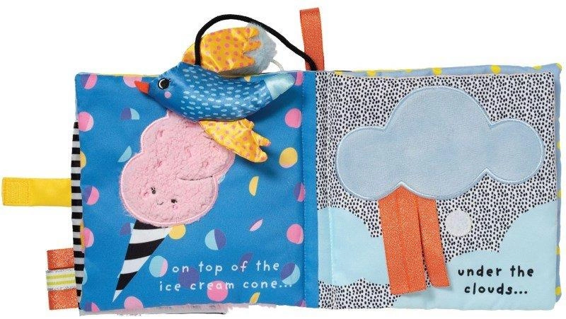 Miękka książeczka z Manhattan Toy to zbiór 6 stron ozdobionych w wyjątkowo pięknym, artystycznym stylu. Książeczka ma przymocowanego ptaszka na tasiemce, marszczenia, pompony, barwne postacie o różnej fakturze, a także pętlę do zamykania.