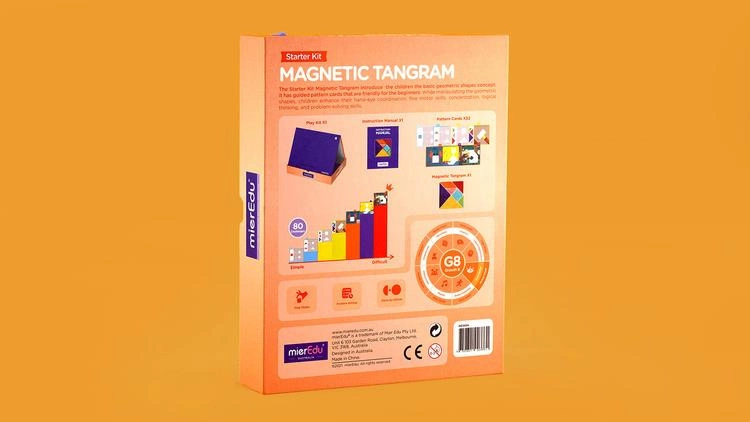 Tangram magnetyczny - gra edukacyjna Poznaję kształty od mierEdu. Ta gra pozwala na wprowadzenie dzieci do świata kształtów geometrycznych. Zawiera karty z wzorami, które są przyjazne dla początkujących. Manipulując geometrycznymi kształtami i tworząc z nich obrazki, dzieci doskonalą koordynację ręka-oko, motorykę małą, koncentrację, logiczne myślenie i umiejętności rozwiązywania problemów, a także w przyjazny sposób zapoznają z angielskimi słówkami. Ten zestaw to aż 80 aktywności do zrealizowania w różnych poziomach trudności - dzięki czemu można łatwo dostosować zabawę do aktualnych umiejętności dziecka. Zestaw zawiera: opakowanie magnetyczne, magnesy x7, dwustronne karty ze wzorami do ułożenia x32, przewodnik dla rodziców. Opakowanie i produkt wykonane są z materiałów eco-friendly. Poznaj pozostałe zestawy gier edukacyjnych od mieEdu.