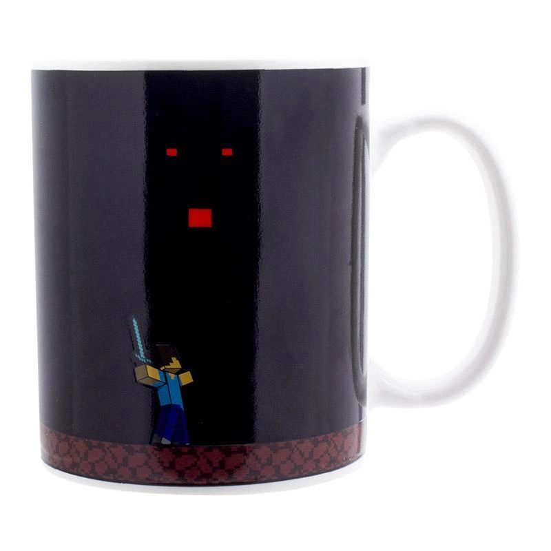 Czarny ceramiczny kubek o pojemności 300 ml przedstawia Steve'a wkraczającego do wymiaru Netheru. Dodaj gorący napój i obserwuj, jak pojawia się Ghast otoczony kulami ognia.