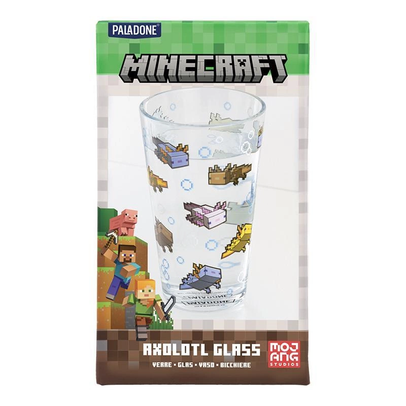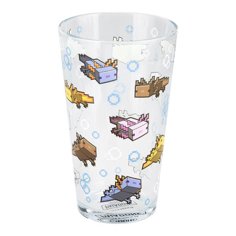 Ta wyjątkowa szklanka o pojemności 400 ml ozdobiona jest powtarzającym się wzorem aksolotli, które występują w grze w różnych kolorach: różowym, brązowym, złotym i niebieskim.