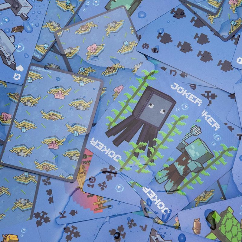Z żywymi wzorami wodnych stworzeń Minecrafta, niebieskie karty przedstawiają podwodne moby, takie jak Elder Guardians, Axolotls, Glow Squids, Dolphins, Turtles i inne. Każda karta jest wodoodporna i łatwa do wyczyszczenia, zapewniając długotrwałą zabawę.