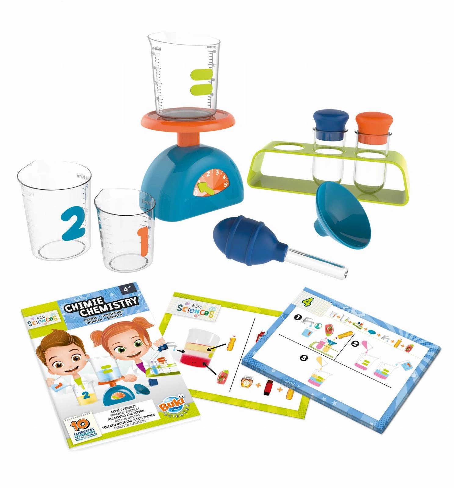 Odkryj chemię i mieszaniny z akcesoriami przyjaznymi dzieciom i zrób 10 eksperymentów wyjaśnionych krok po kroku.