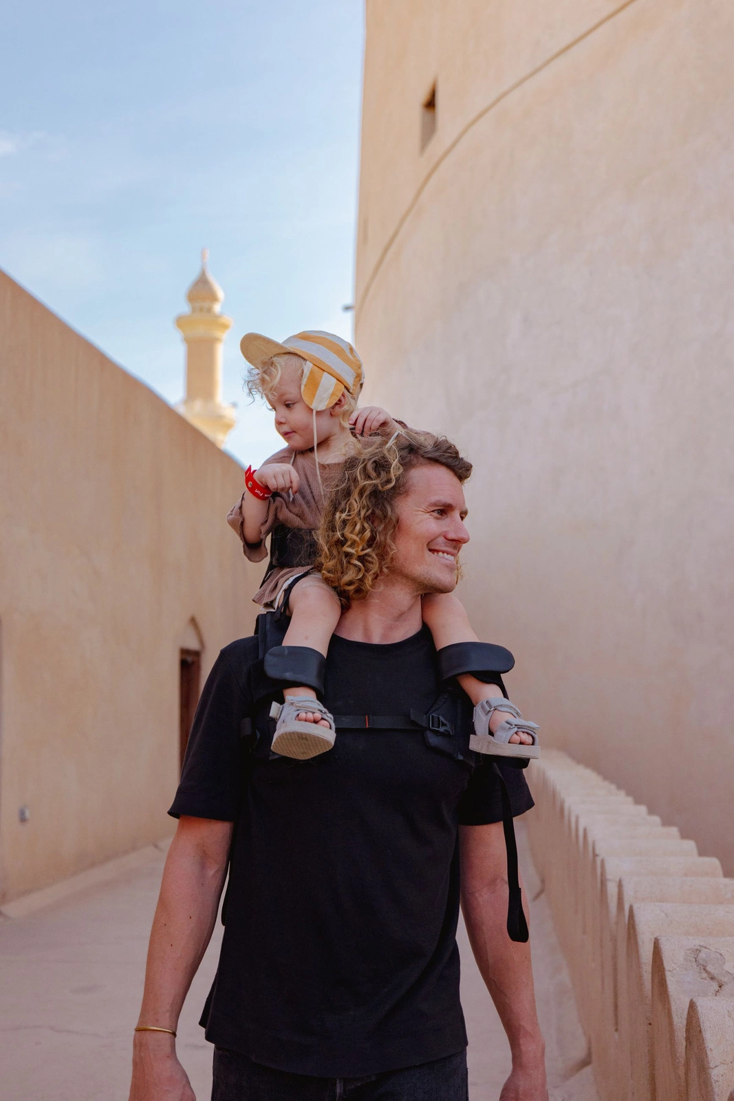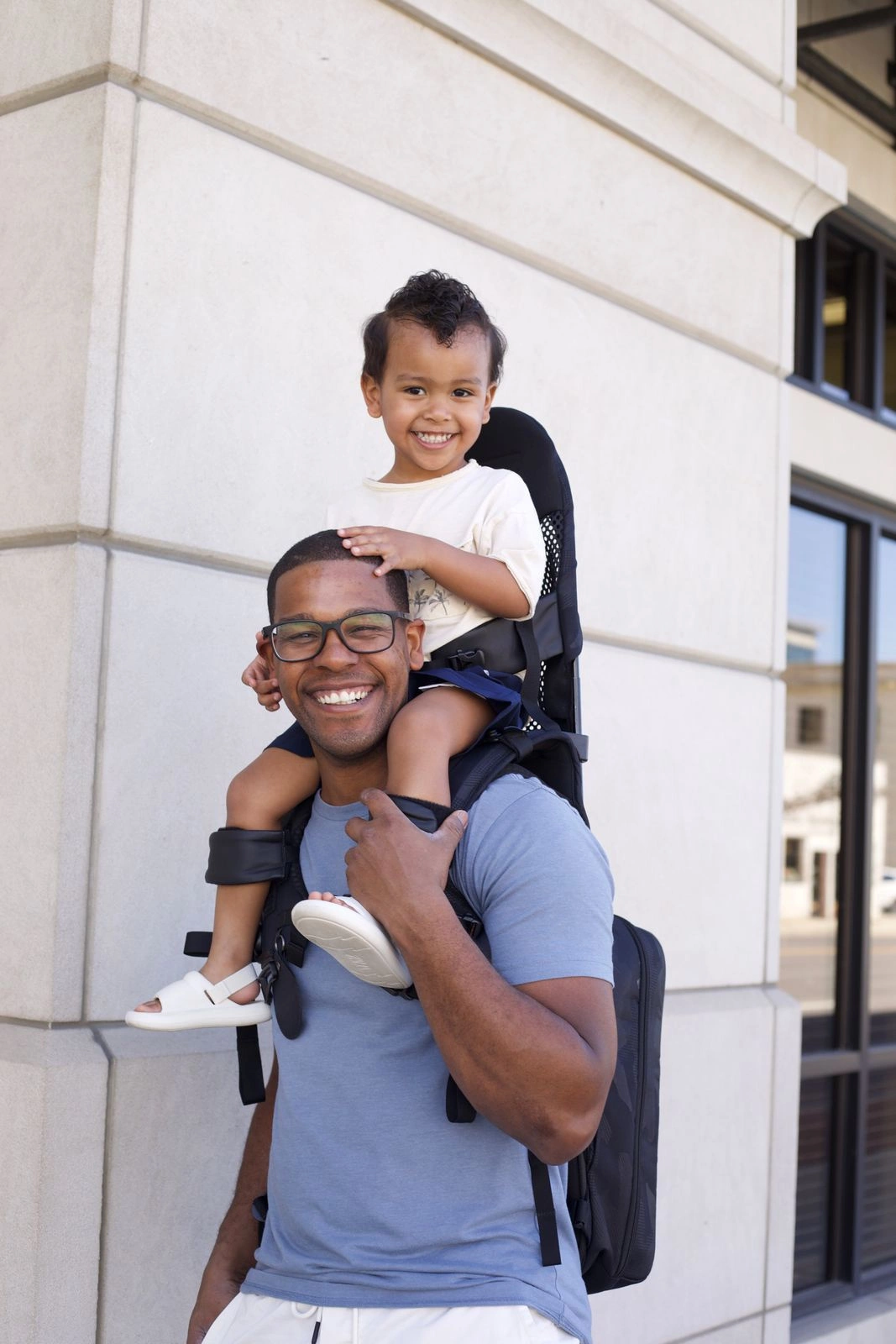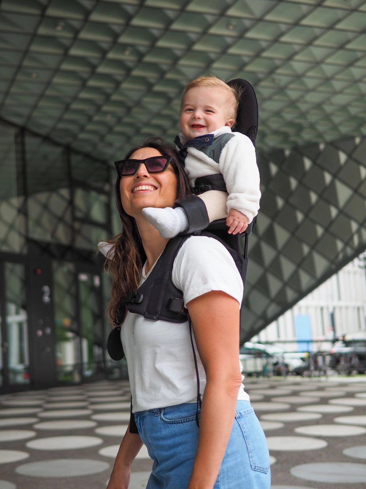 Dla naszych najmniejszych użytkowników (ok. 6 – 10 miesięcy) MiniMeis posiada opcjonalny pasek na ramię, który może służyć jako dodatkowe wsparcie i bezpieczeństwo. Dzięki temu pasowi dziecko zabezpieczone jest opatentowaną 9-punktową uprzężą. Więcej informacji znajdziesz w naszym przewodniku dla początkujących. MiniMeis G4 jest wyposażony w opatentowany system rozkładu ciężaru, który pozwala dziecku siedzieć na podwyższonym podbiciu, unikając bezpośredniego nacisku na szyję, ramiona i obojczyk osoby dorosłej. Jedynym zmartwieniem rodziców jest to, aby mieć świadomość przeszkód nad głową, co miałoby miejsce również w przypadku noszenia dziecka na ramionach bez MiniMeis.