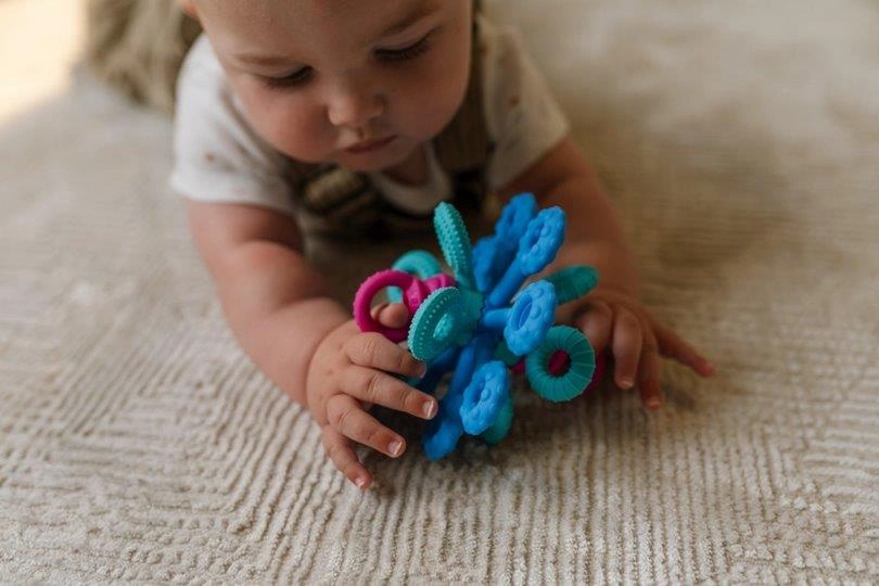 Każde ramię różni się kolorem, fakturą i kształtem, dzięki czemu zabawka wspiera rozwój sensoryczny i motoryczny dziecka już od pierwszych miesięcy życia.