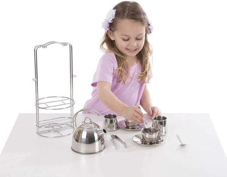 Modny, stalowy serwis do herbaty Melissa & Doug to niezbędny element każdej mini kuchni. Mali miłośnicy przyjęć i wystawnych spotkań mogą urządzić sympatyczne spotkanie przy herbatce, na które zaproszą lalki, misie, a także innych domowników. W zestawie znajdziemy dzbanek do herbaty z pokrywką, 2 kubki, 2 spodki, 2 łyżeczki do herbaty, pojemnik na mleko, cukiernicę i szczypce. Czajnik posiada wytrzymałe uchwyty z nitowanymi połączeniami, które nie osłabiają się ani nie zużywają. Wszystkie akcesoria mieszczą się na wygodnym stojaku, który ułatwi ich przechowywanie. W trakcie zabawy serwisem do herbaty Melissa and Doug nasze pociechy będą mogły rozwijać wyobraźnię, poszerzać słownictwo, a także ćwiczyć motorykę małą nabierając kostki cukru szczypcami.