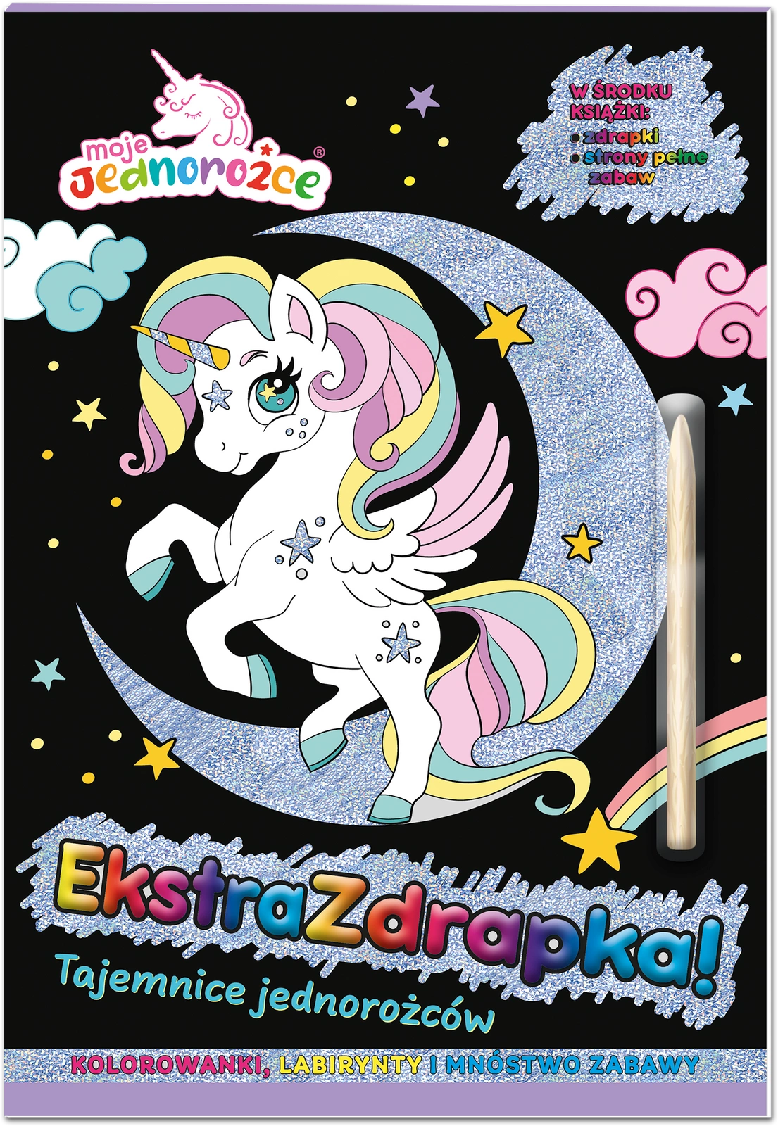 Moje Jednorożce. Ekstrazdrapka to atrakcyjna książka wspomagająca zdolności manualne u dzieci. Zawiera kolorowanki, labirynty, kolorowe strony do zdrapywania oraz rysik. Wystarczy rysikiem zdrapać farbę, aby pojawiły się błyszczące obrazki lub wielobarwne ilustracje z magicznymi stworzeniami.