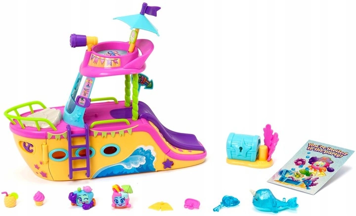 Zestaw Impreza na łodzi składa się z kolorowej łodzi z dostępnym miejscem pod pokładem i zjeżdżalnią, którą można zjechać wprost do wody. Dodatkowo w zestawie znajdują się również akcesoria plażowe oraz podwodna skrzynia skarbów z kluczem i figurka narwala oraz zaproszenie na imprezę.